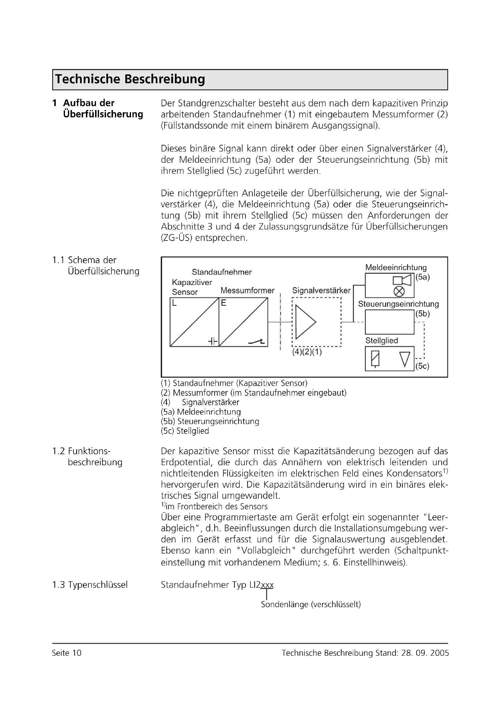 Sachnr. 701679/04 11/06Seite / Page 2 DEUTSCH Inhalt Zulassung nach WHG ... Seite 3 Technische Beschreibung ... Seite 11 1 Aufbau der Überfüllsicherung ... Seite 11 2 Werkstoffe der Standaufnehmer ... Seite 12 3 Einsatzbereich ... Seite 16 4 Störmeldungen, Fehlermeldungen ... Seite 16 5 Einbauhinweise ... Seite 16 6 Einstellhinweise ... Seite 17 7 Betriebsanweisung ...Seite 21 8 Wiederkehrende Prüfungen ... Seite 21 ENGLISH Contents 1 Function and features ... page 22 2 Installation ... page 23 3 Electrical connection ... page 23 4 Programming ... page 24 5 Installation and set-up / operation ... page 26 6 Technical data ...page 27 Scale drawing ... page 27 Français Contenu 1 Fonctionnement et caractéristiques ... page 28 2 Montage ... page 29 3 Raccordement électrique ... page 29 4 Programmation ... page 30 5 Mise en service / Fonctionnement ... page 32 6 Données techniques ...page 33 Dimensions ... page 33Seite 3 DEUTSCHSeite 4Seite 5 DEUTSCHSeite 6Seite 7 DEUTSCHSeite 8Seite 9 DEUTSCHDer Standgrenzschalter besteht aus dem nach dem kapazitiven Prinzip arbeitenden Standaufnehmer (1) mit eingebautem Messumformer (2) (Füllstandssonde mit einem binärem Ausgangssignal). Dieses binäre Signal kann direkt oder über einen Signalverstärker (4), der Meldeeinrichtung (5a) oder der Steuerungseinrichtung (5b) mit ihrem Stellglied (5c) zugeführt werden. Die nichtgeprüften Anlageteile der Überfüllsicherung, wie der Signal- verstärker (4), die Meldeeinrichtung (5a) oder die Steuerungseinrich- tung (5b) mit ihrem Stellglied (5c) müssen den Anforderungen der Abschnitte 3 und 4 der Zulassungsgrundsätze für Überfüllsicherungen (ZG-ÜS) entsprechen. Der kapazitive Sensor misst die Kapazitätsänderung bezogen auf das Erdpotential, die durch das Annähern von elektrisch leitenden und nichtleitenden Flüssigkeiten im elektrischen Feld eines Kondensators