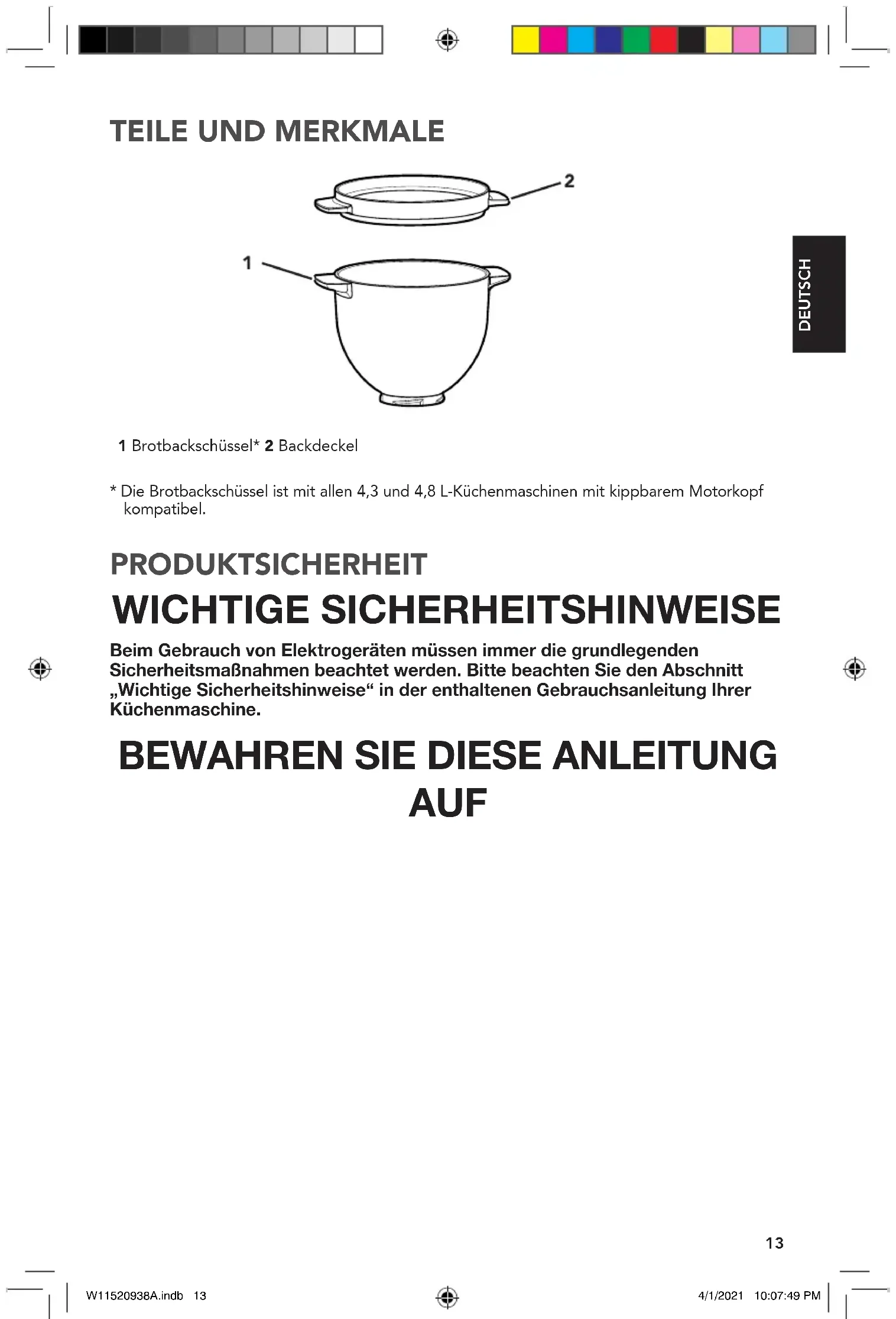 1 Brotbackschüssel* 2 Backdeckel PRODUKTSICHERHEIT WICHTIGE SICHERHEITSHINWEISE Beim Gebrauch von Elektrogeräten müssen immer die grundlegenden Sicherheitsmaßnahmen beachtet werden. Bitte beachten Sie den Abschnitt „Wichtige Sicherheitshinweise“ in der enthaltenen Gebrauchsanleitung Ihrer Küchenmaschine.