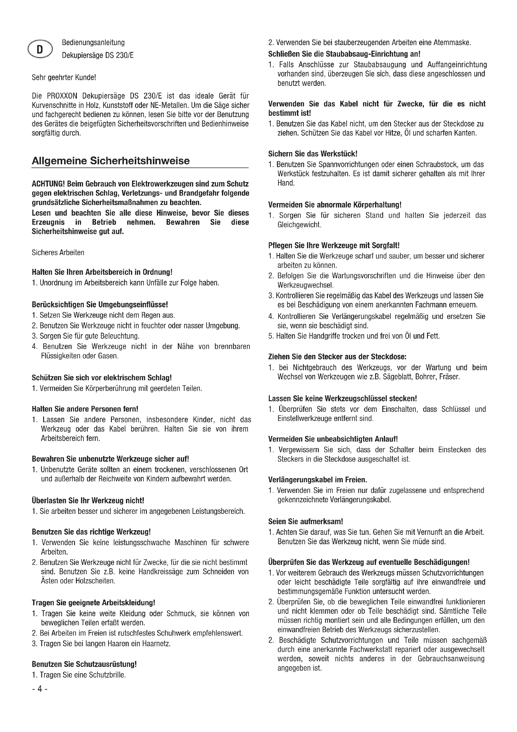 DS 230E - Säge PROXXON - Kostenlose Bedienungsanleitung