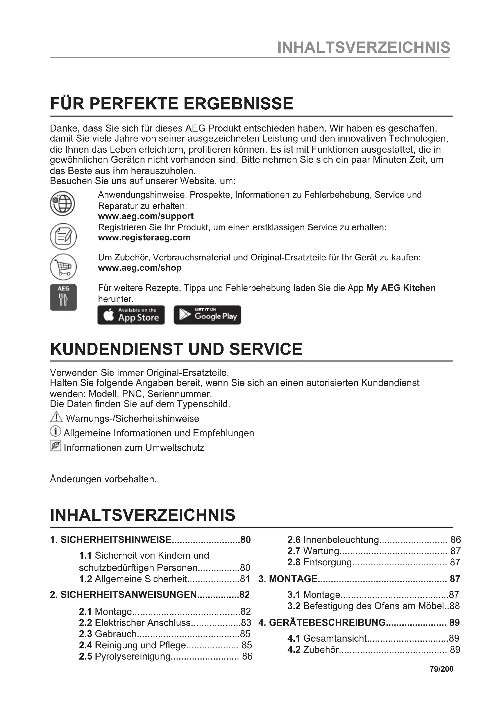 Danke, dass Sie sich für dieses AEG Produkt entschieden haben. Wir haben es geschaffen, damit Sie viele Jahre von seiner ausgezeichneten Leistung und den innovativen Technologien, die Ihnen das Leben erleichtern, profitieren können. Es ist mit Funktionen ausgestattet, die in gewöhnlichen Geräten nicht vorhanden sind. Bitte nehmen Sie sich ein paar Minuten Zeit, um das Beste aus ihm herauszuholen. Besuchen Sie uns auf unserer Website, um: Anwendungshinweise, Prospekte, Informationen zu Fehlerbehebung, Service und Reparatur zu erhalten: www.aeg.com/support Registrieren Sie Ihr Produkt, um einen erstklassigen Service zu erhalten: www.registeraeg.com Um Zubehör, Verbrauchsmaterial und Original-Ersatzteile für Ihr Gerät zu kaufen: www.aeg.com/shop Für weitere Rezepte, Tipps und Fehlerbehebung laden Sie die App My AEG Kitchen herunter.