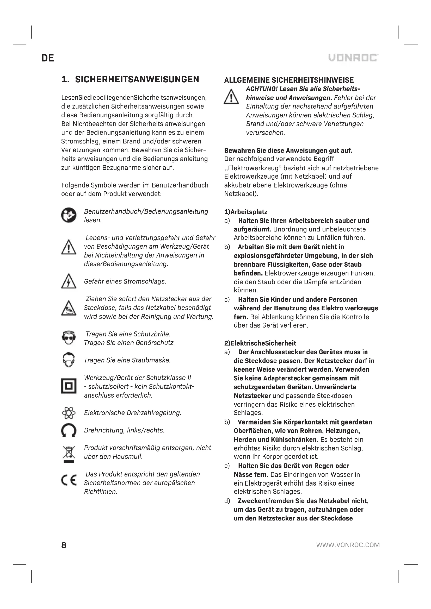 chen Lappen, der leicht mit Seifenwasser befeuch- tet wurde. Verwenden Sie keine Lösungsmittel wie Benzin, Alkohol, Ammoniak usw., da Chemikalien dieser Art die Kunststoffteile beschädigen. UMWELTSCHUTZ Schadhafte und/oder zu entsorgende elektrische oder elektronische Werkzeuge und Geräte müssen an den dafür vorgesehenen Recycling-Stellen abgegeben werden. Nur für EG-Länder Entsorgen Sie Elektrowerkzeuge nicht über den Hausmüll. Entsprechend der EU-Richtlinie 2012/19/EG über Elektro- und Elektronik-Altgeräte sowie der Umsetzung in nationales Recht müssen Elektrowerkzeuge, die nicht mehr im Gebrauch sind, getrennt gesammelt und umweltschonend entsorgt werden. GARANTIE VONROC-Produkte werden nach den höchsten Qua li täts stan dards entwickelt und sind für den gesetz lich festgelegten Zeitraum, ausgehend von dem ur sprüng lichen Kauf datum, garantiert frei von Fehlern in Material und Aus führ ung. Sollte das Produkt in diesem Zeitraum aufgrund von Material- und/oder Ver ar bei tungs mängeln Fehler aufweisen, wenden Sie sich bitte direkt an VONROC Kunden- dienst. Folgende Umstände sind von der Garantie ausge- schlossen: