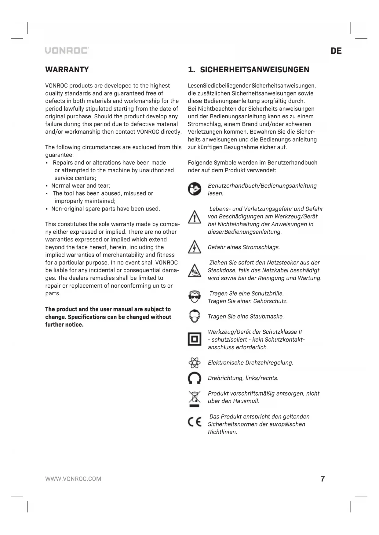 VONROC-Produkte werden nach den hochsten Qua li tats stan dards entwickelt und sind für den gesetzlich festgelegten Zeitraum, ausgehend von dem ur sprung lichen Kauf datum, garantiert frei von Fehlern in Material und Aus führung. Sollte das Produkt in dieser Zeitraum aufgrund von Material-und/oderVerarbeitungsmängelnFehleraufweisen, wenden Sie sichitte direkt an VONROC Kundendienst.