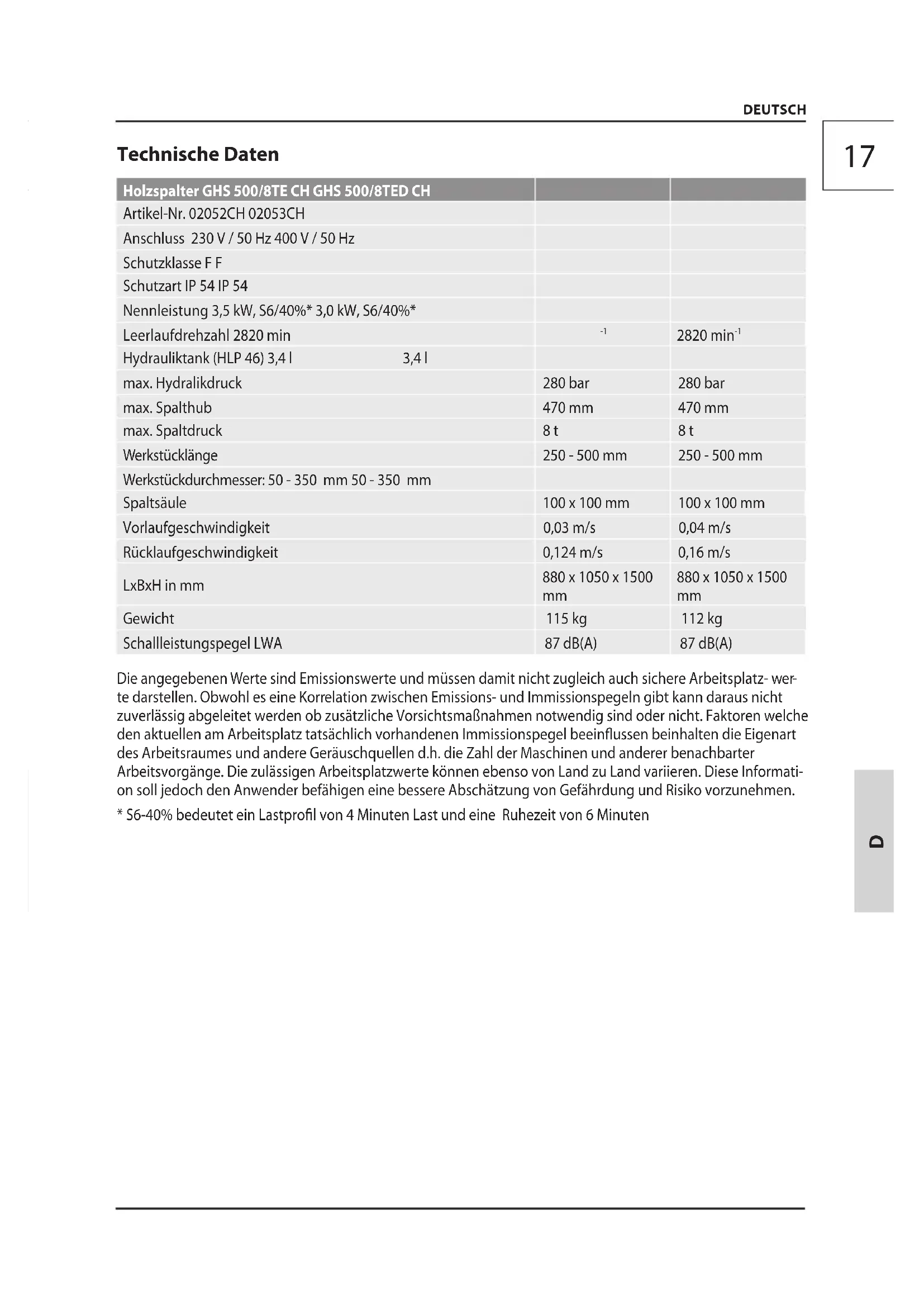 DEUTSCH Technische Daten Holzspalter GHS 500/8TE CH GHS 500/8TED CH Artikel-Nr. 02052CH 02053CH Anschluss 230 V / 50 Hz 400 V / 50 Hz Schutzklasse F F Schutzart IP 54 IP 54 Nennleistung 3,5 kW, S6/40%* 3,0 kW, S6/40%* Leerlaufdrehzahl 2820 min