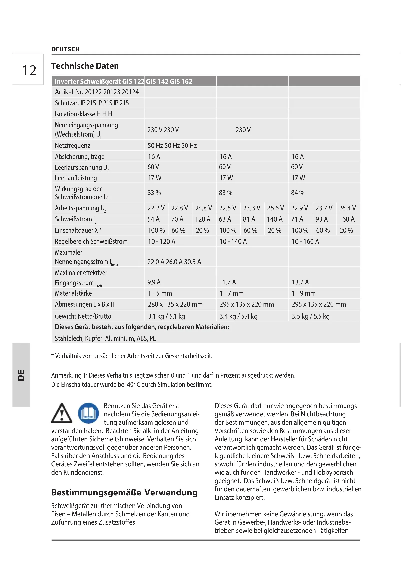 Dieses Gerät darf nur wie angegeben bestimmungs- gemäß verwendet werden. Bei Nichtbeachtung derBestimmungen, aus den allgemein gültigen Vorschriftensowie den Bestimmungen aus dieser Anleitung, kann der Hersteller für Schäden nicht verantwortlich gemacht werden. Das Gerät ist für ge- legentliche kleinere Schweiß - bzw. Schneidarbeiten, sowohl für den industriellen und den gewerblichen wie auch für den Handwerker - und Hobbybereich geeignet. Das Schweiß-bzw. Schneidgerät ist nicht für den dauerhaften, gewerblichen bzw. industriellen Einsatz konzipiert. Wir übernehmen keine Gewährleistung, wenn das Gerät in Gewerbe-, Handwerks- oder Industriebe- trieben sowie bei gleichzusetzenden Tätigkeiten Benutzen Sie das Gerät erst nachdem Sie die Bedienungsanlei- tung aufmerksam gelesen und verstanden haben. Beachten Sie alle in der Anleitung aufgeführten Sicherheitshinweise. Verhalten Sie sich verantwortungsvoll gegenüber anderen Personen. Falls über den Anschluss und die Bedienung des Gerätes Zweifel entstehen sollten, wenden Sie sich an den Kundendienst. Bestimmungsgemäße Verwendung Schweißgerät zur thermischen Verbindung von Eisen – Metallen durch Schmelzen der Kanten und Zuführung eines Zusatzstoes. DEUTSCH Technische Daten Inverter Schweißgerät GIS 122 GIS 142 GIS 162 Artikel-Nr. 20122 20123 20124 Schutzart IP 21S IP 21S IP 21S Isolationsklasse H H H Nenneingangsspannung (Wechselstrom) U