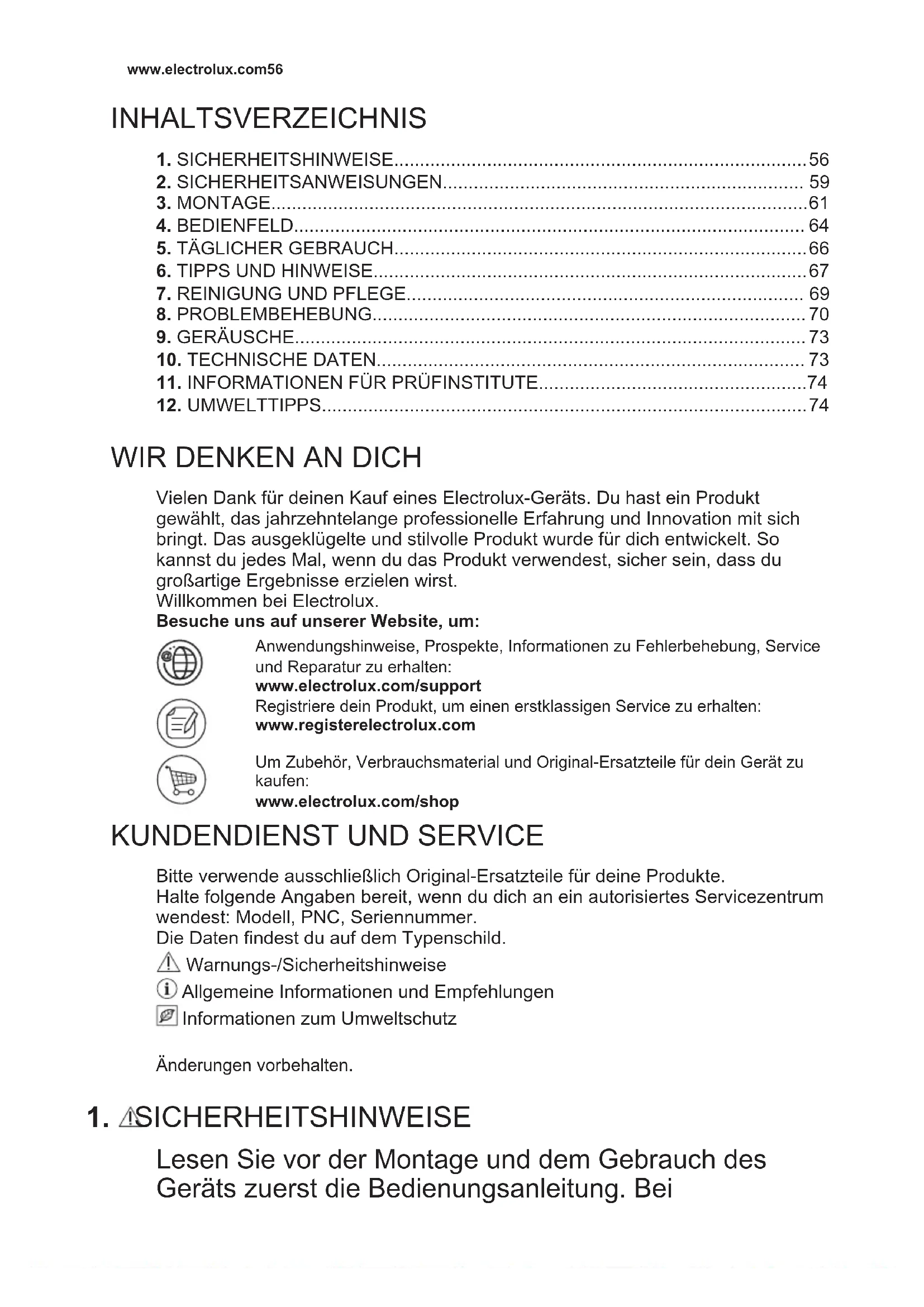 Vielen Dank für deinen Kauf eines Electrolux-Geräts. Du hast ein Produkt gewählt, das jahrzehntelange professionelle Erfahrung und Innovation mit sich bringt. Das ausgeklügelte und stilvolle Produkt wurde für dich entwickelt. So kannst du jedes Mal, wenn du das Produkt verwendest, sicher sein, dass du großartige Ergebnisse erzielen wirst. Willkommen bei Electrolux. Besuche uns auf unserer Website, um: Anwendungshinweise, Prospekte, Informationen zu Fehlerbehebung, Service und Reparatur zu erhalten: www.electrolux.com/support Registriere dein Produkt, um einen erstklassigen Service zu erhalten: www.registerelectrolux.com Um Zubehör, Verbrauchsmaterial und Original-Ersatzteile für dein Gerät zu kaufen: www.electrolux.com/shop