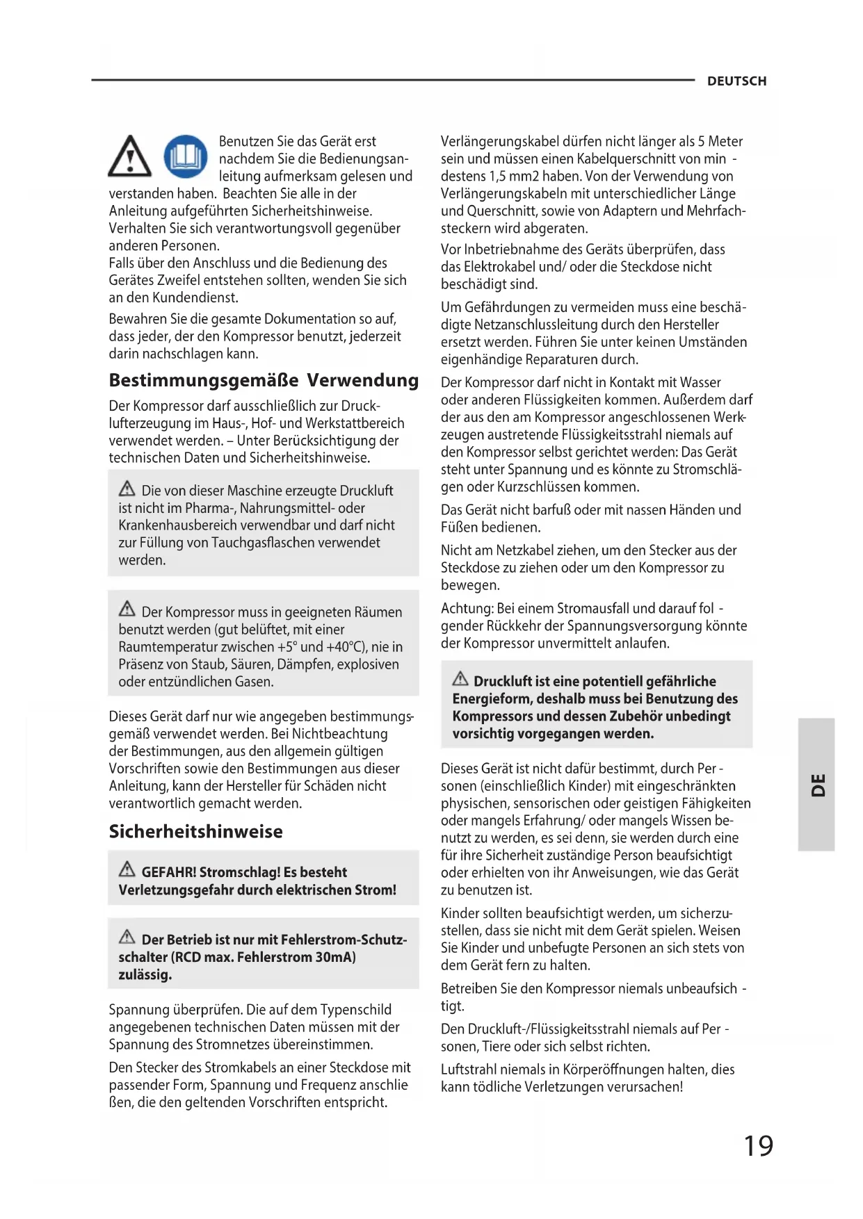 Benutzen Sie das Gerät erst nachdem Sie die Bedienungsan- leitung aufmerksam gelesen und verstanden haben. Beachten Sie alle in der Anleitung aufgeführten Sicherheitshinweise. Verhalten Sie sich verantwortungsvoll gegenüber anderen Personen. Falls über den Anschluss und die Bedienung des Gerätes Zweifel entstehen sollten, wenden Sie sich an den Kundendienst. Bewahren Sie die gesamte Dokumentation so auf, dass jeder, der denKompressor benutzt, jederzeit darin nachschlagen kann. Bestimmungsgemäße Verwendung Der Kompressor darf ausschließlich zur Druck- lufterzeugungim Haus-, Hof- und Werkstattbereich verwendet werden. – Unter Berücksichtigung der technischen Daten und Sicherheitshinweise. Die von dieser Maschine erzeugte Druckluft ist nicht im Pharma-,Nahrungsmittel- oder Krankenhausbereich verwendbar und darf nicht zurFüllung von Tauchgasaschen verwendet werden. Der Kompressor muss in geeigneten Räumen benutzt werden (gut belüftet,mit einer Raumtemperatur zwischen +5° und +40°C), nie in Präsenz vonStaub, Säuren, Dämpfen, explosiven oder entzündlichen Gasen. Dieses Gerät darf nur wie angegeben bestimmungs