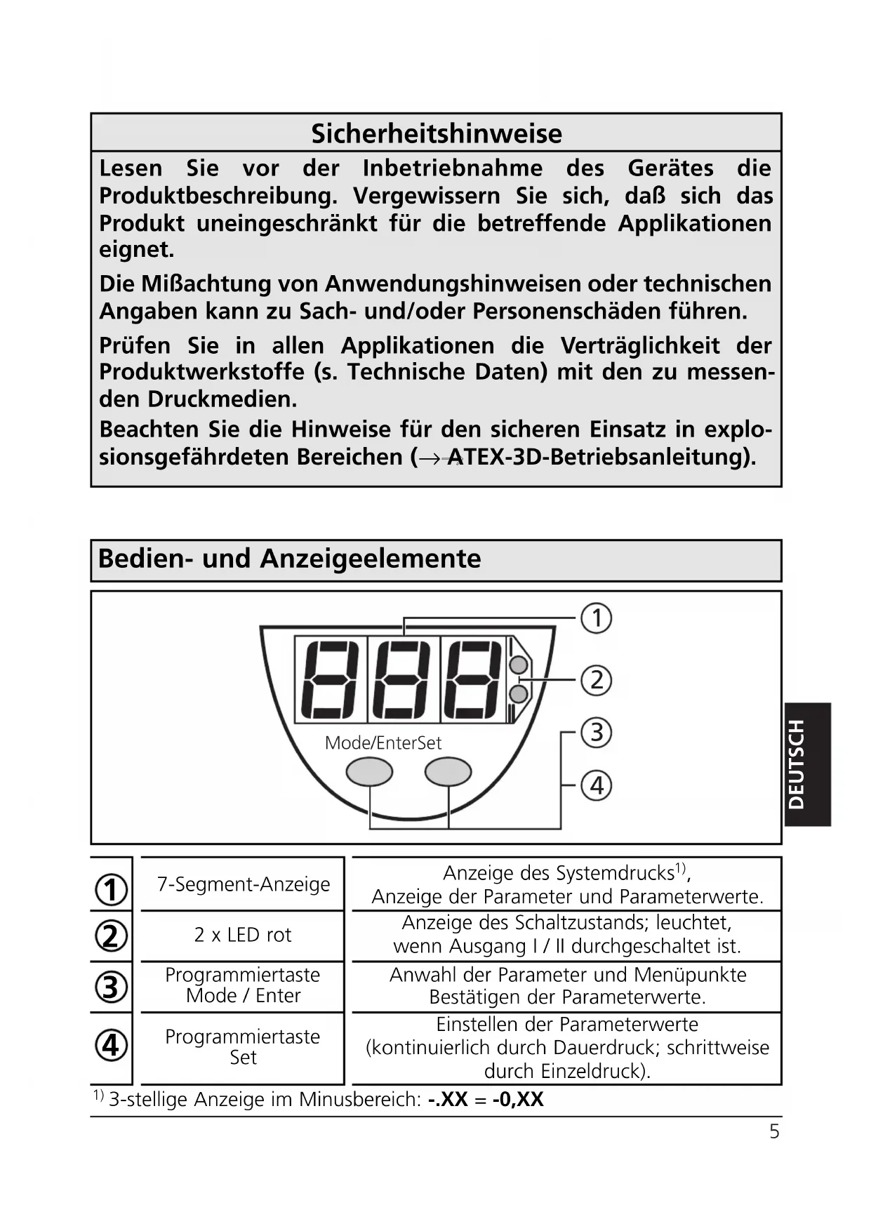 > 5s 1 x Parameter aufrufen Select parameters Sélectionner les paramètres Werte einstellen* Set Values* Régler la valeurs* Werte bestätigen Acknowledgement of values Confirmer la valeur *Wert verringern: Lassen Sie die Anzeige bis zum maximalen Einstellwert laufen. Danach beginnt der Durchlauf wieder beim minimalen Einstellwert. *Decrease the value: Let the display of the parameter value move to the maximum setting value. Then the cycle starts again at the minimum setting value. *Réduire la valeur du paramètre: Laisser l'affichage de la valeur du paramètre aller jusqu'à la valeur de réglage maximum. Ensuite le cycle recommence à la valeur de réglage minimum.5 DEUTSCH Sicherheitshinweise Lesen Sie vor der Inbetriebnahme des Gerätes die Produktbeschreibung. Vergewissern Sie sich, daß sich das Produkt uneingeschränkt für die betreffende Applikationen eignet. Die Mißachtung von Anwendungshinweisen oder technischen Angaben kann zu Sach- und/oder Personenschäden führen. Prüfen Sie in allen Applikationen die Verträglichkeit der Produktwerkstoffe (s. Technische Daten) mit den zu messen- den Druckmedien. Beachten Sie die Hinweise für den sicheren Einsatz in explo- sionsgefährdeten Bereichen (