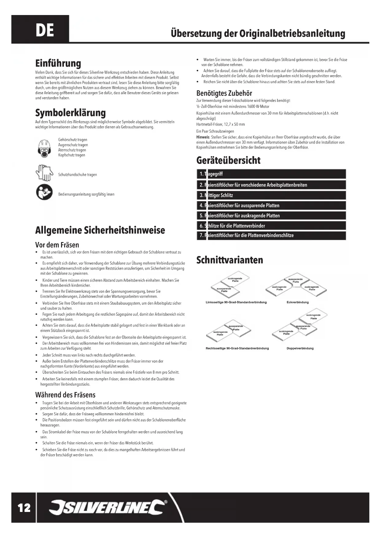 Schnittvarianten Linksseitige 90-Grad-StandardverbindungEckverbindungDoppelverbindungRechtsseitige 90-Grad-Standardverbindungaussparende Platteauskragende Platteauskragende Platteauskragende Platteauskragende Platteauskragende Platteaussparende Platteaussparende Platteaussparende Platteauskragende Platte Übersetzung der Originalbetriebsanleitung Symbolerklärung AufdemTypenschilddesWerkzeugssindmöglicherweiseSymboleabgebildet.SievermittelnwichtigeInformationenüberdasProduktoderdienenalsGebrauchsanweisung.GehörschutztragenAugenschutztragenAtemschutztragenKopfschutztragenSchutzhandschuhetragenBedienungsanleitungsorgfältiglesen Einführung VielenDank,dassSiesichfürdiesesSilverline-Werkzeugentschiedenhaben.DieseAnleitungenthältwichtigeInformationenfürdassichereundeffektiveArbeitenmitdiesemProdukt.SelbstwennSiebereitsmitähnlichenProduktenvertrautsind,lesenSiedieseAnleitungbittesorgfältigdurch,umdengrößtmöglichenNutzenausdiesemWerkzeugziehenzukönnen.BewahrenSiedieseAnleitunggriffbereitaufundsorgenSiedafür,dassalleBenutzerdiesesGerätssiegelesenundverstandenhaben. Allgemeine Sicherheitshinweise Vor dem Fräsen