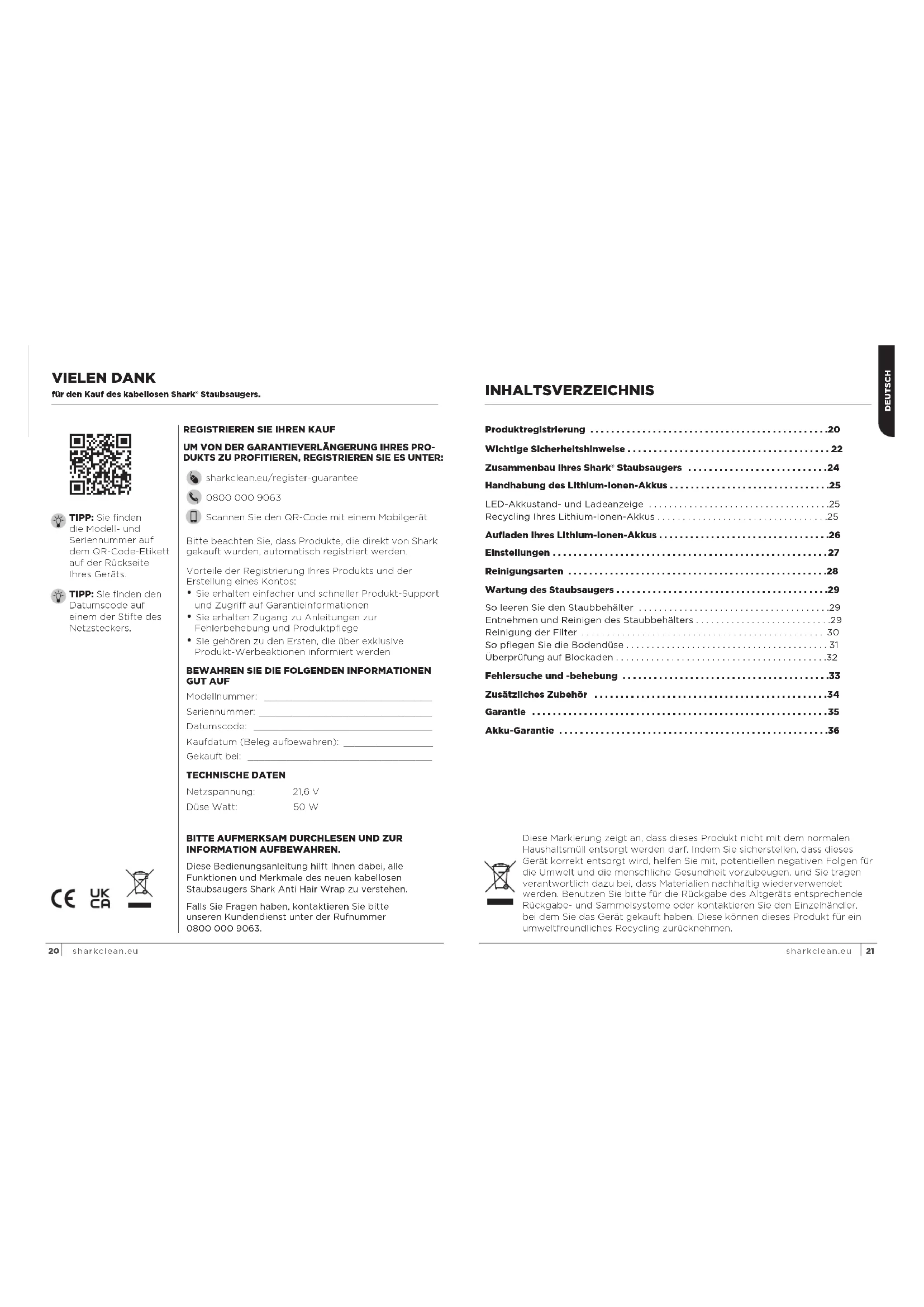 Lithium-Ionen-Akku DEUTSCH Wenn ein Verbraucher ein Produkt in Europa kauft, erhält er automatisch Rechte hinsichtlich der Produktqualität (Ihre „gesetzlichen Rechte“). Sie können diese Rechte Ihrem Einzelhändler gegenüber geltend machen. Allerdings haben wir von Shark so großes Vertrauen in die Qualität unserer Produkte, dass wir für das Produkt eine zusätzliche Herstellergarantie von bis zu fünf Jahren gewähren (2 Jahr standardmäßig plus 3Jahre bei erfolgter Registrierung). Diese Bedingungen beziehen sich nur auf unsere Herstellergarantie– Ihre gesetzlichen Rechte sind davon unberührt. In den nachstehenden Bedingungen werden die Bedingungen und der Umfang Ihrer Garantie, die von der SharkNinja Germany GmbH, Kurt-Blaum- Platz 8, 63450 Hanau (Deutschland) gegeben werden. Sie beeinträchtigen keine gesetzlichen Rechte aus dem Kaufvertrag mit dem Einzelhändler, bei dem Sie das Produkt erworben haben, oder die Verpflichtungen Ihres Einzelhändlers aus dem Kauf und die Ihres Kaufvertrags mit ihm. Die 5-Jahres-Garantie gilt nicht für den Lithium-Ionen-Akku (siehe Akku-Garantie auf der nächsten Seite). Shark®-Garantie Ein Haushaltsgerät wie Ihr Staubsauger bedeutet eine beträchtliche Investition. Ihr neues Gerät sollte daher so lange wie möglich funktionieren. Die Garantie spielt dabei eine wichtige Rolle und spiegelt wider, wie viel Vertrauen der Hersteller in sein Produkt und die Herstellungsqualität hat. Jedes Shark-Gerät besitzt eine Garantie für kostenlose Teile und Arbeitszeit. Unsere Kundendienst-Helpline (0800 000 9063) ist von Montag bis Freitag von 9.00 bis 18.00Uhr für Sie da. Der Anruf ist kostenlos, und Sie werden sofort zu einem Mitarbeiter von Shark durchgestellt. Online-Support finden Sie auch unter www.sharkclean.eu Wie registriere ich meine verlängerte Shark®-Garantie? Sie können Ihre Garantie innerhalb von 28Tagen ab dem Kaufdatum online registrieren. Um Zeit zu sparen, halten Sie bitte die folgenden Informationen zu Ihrem Gerät bereit: