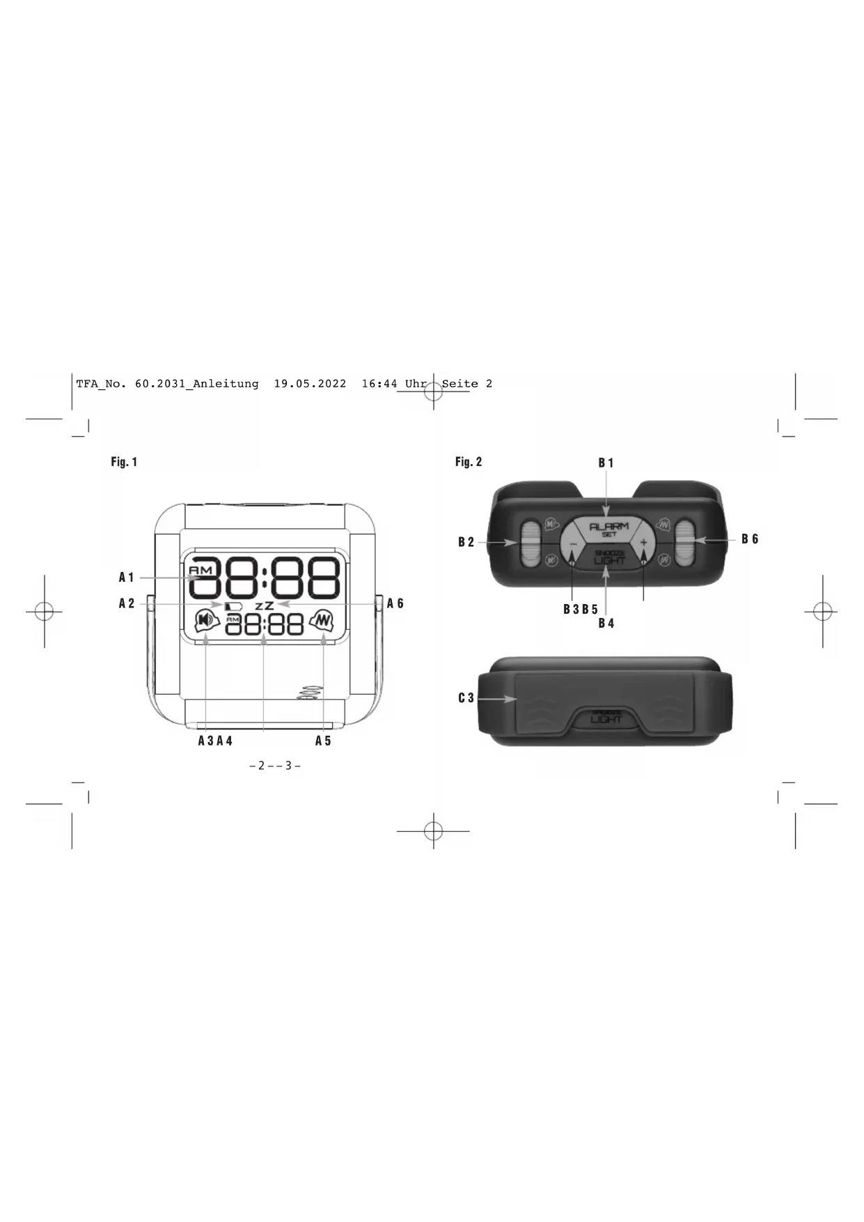 A 1 A 2 B 2 C 3 TFA_No. 60.2031_Anleitung 19.05.2022 16:44 Uhr Seite 2– 4 – – 5 – Fig. 3 C 1 Digitaler Reisewecker mit Vibration