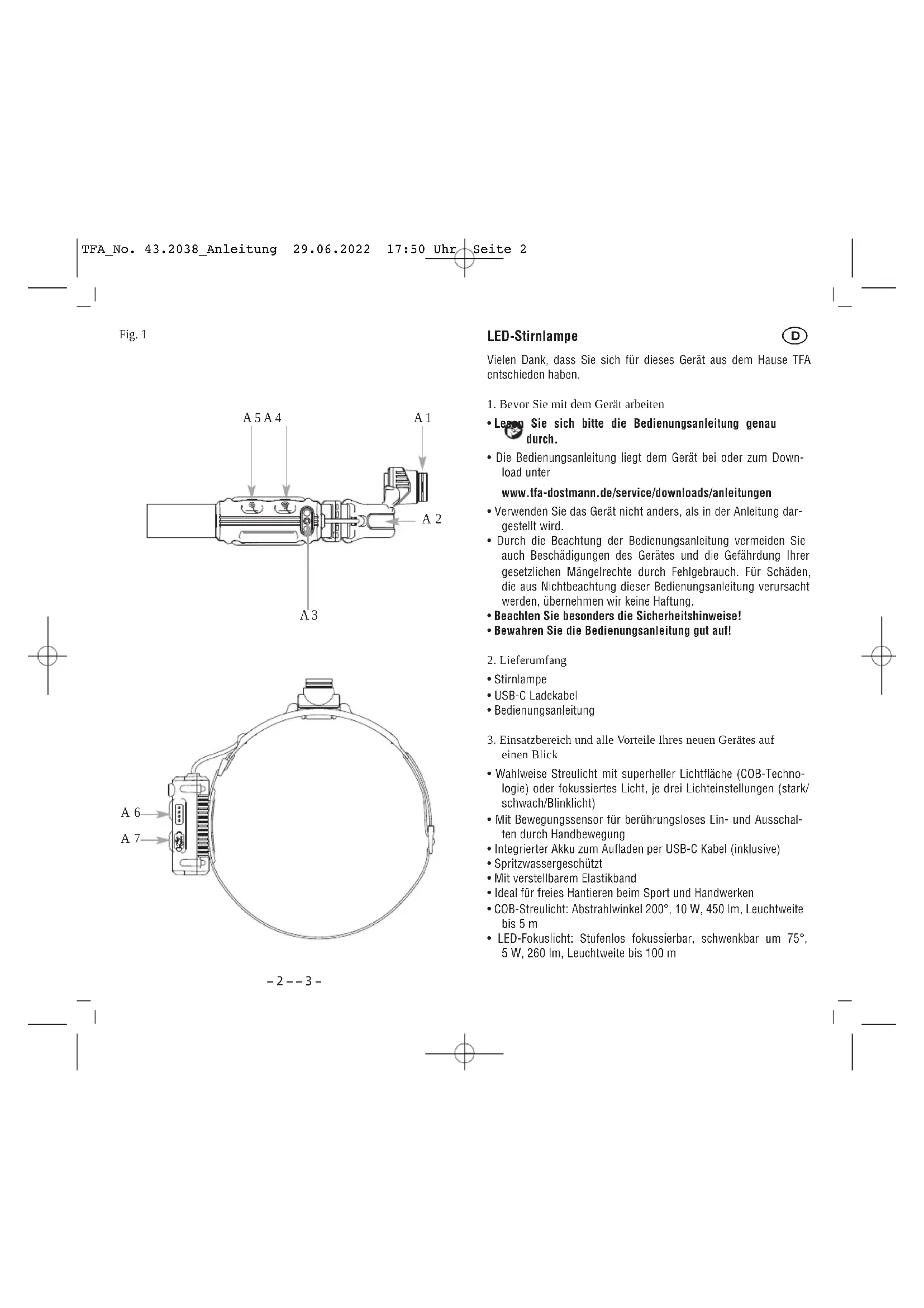 - LED-Fokuslicht: Stufenlos fokussierbar, schwenkbar um 75°, 5 W, 260 lm, Leuchtweite bis 100 m TFA_No. 43.2038_Anleitung 29.06.2022 17:50 Uhr Seite 2– 4 – – 5 – LED-Stirnlampe