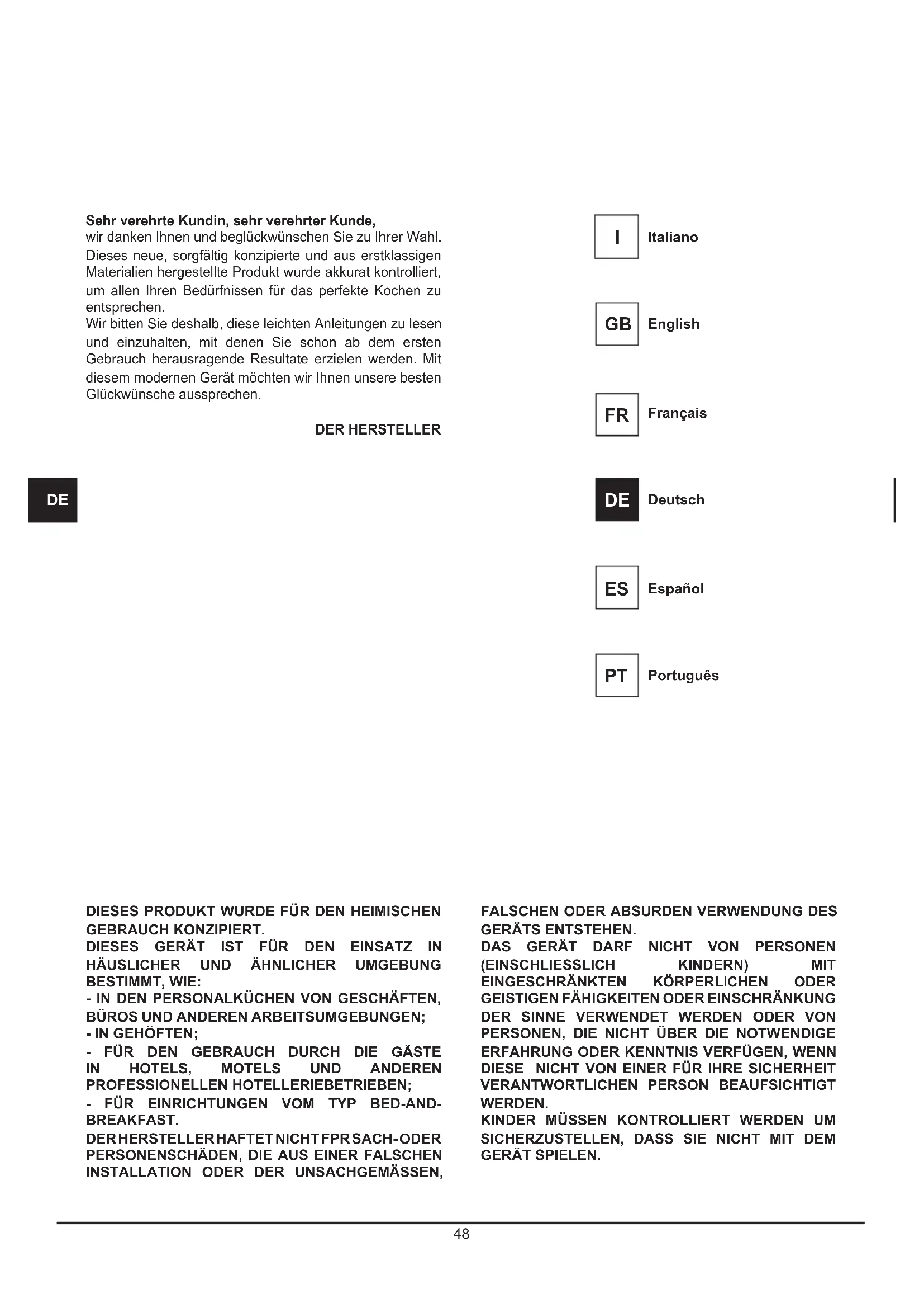 GERÄT SPIELEN. Sehr verehrte Kundin, sehr verehrter Kunde, wir danken Ihnen und beglückwünschen Sie zu Ihrer Wahl. Dieses neue, sorgfältig konzipierte und aus erstklassigen Materialien hergestellte Produkt wurde akkurat kontrolliert, um allen Ihren Bedürfnissen für das perfekte Kochen zu entsprechen. Wir bitten Sie deshalb, diese leichten Anleitungen zu lesen und einzuhalten, mit denen Sie schon ab dem ersten Gebrauch herausragende Resultate erzielen werden. Mit diesem modernen Gerät möchten wir Ihnen unsere besten Glückwünsche aussprechen. DER HERSTELLER Italiano