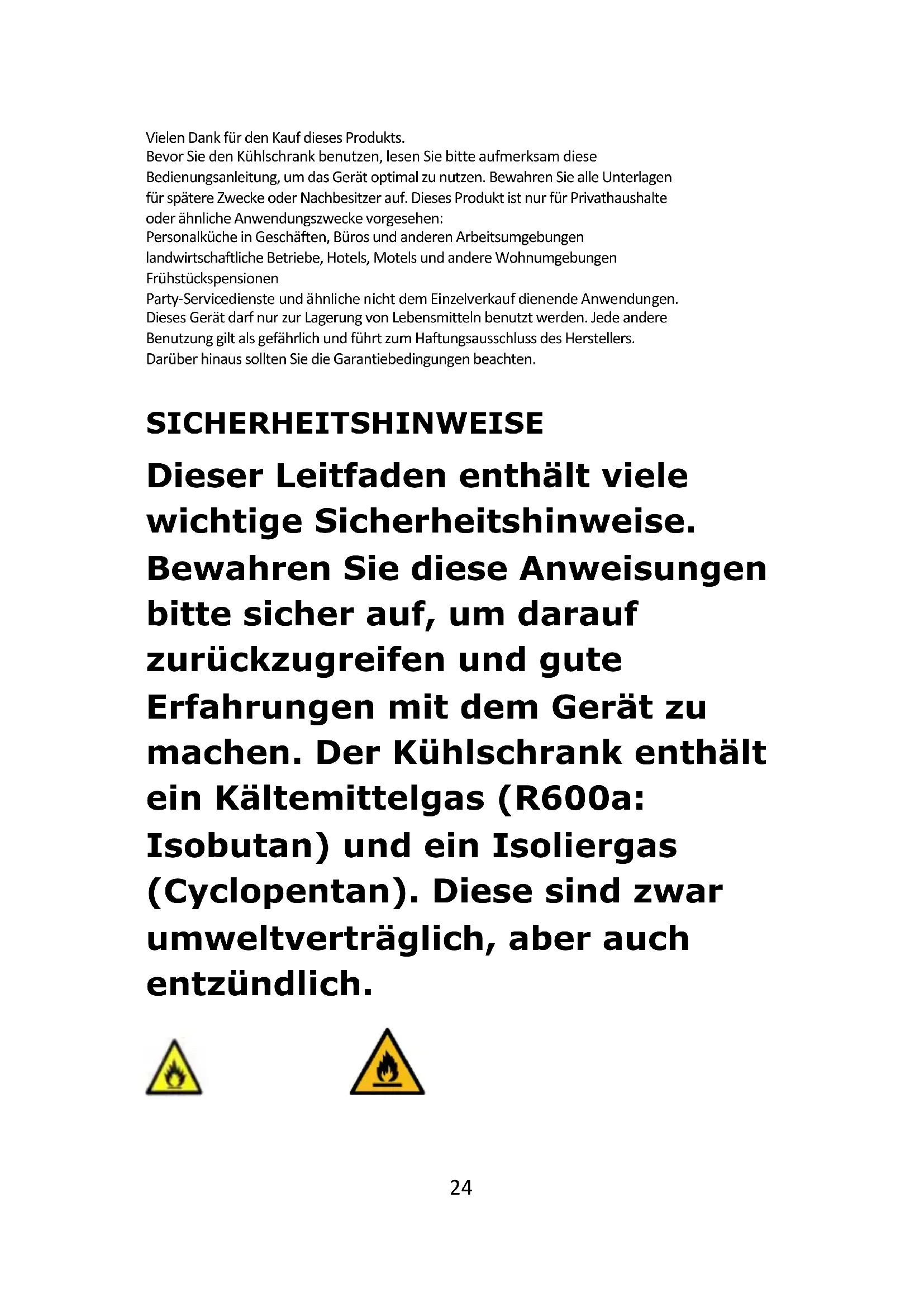Ensuring the door seals correctly: It is normal for the seal to be compressed after the door has been reversed. With the door closed, use a hair dryer to expand the seal and fill the gap between the door and the body of the appliance. Take care not to use the hair dryer too close to the appliance, which could damage the seal. A distance of approximately 10cm should be adequate. When completed, allow the seal and door to cool before touching them. Once done, the seal should remain in position.24 Vielen Dank für den Kauf dieses Produkts. Bevor Sie den Kühlschrank benutzen, lesen Sie bitte aufmerksam diese Bedienungsanleitung, um das Gerät optimal zu nutzen. Bewahren Sie alle Unterlagen für spätere Zwecke oder Nachbesitzer auf. Dieses Produkt ist nur für Privathaushalte oder ähnliche Anwendungszwecke vorgesehen: Personalküche in Geschäften, Büros und anderen Arbeitsumgebungen landwirtschaftliche Betriebe, Hotels, Motels und andere Wohnumgebungen Frühstückspensionen Party-Servicedienste und ähnliche nicht dem Einzelverkauf dienende Anwendungen. Dieses Gerät darf nur zur Lagerung von Lebensmitteln benutzt werden. Jede andere Benutzung gilt als gefährlich und führt zum Haftungsausschluss des Herstellers. Darüber hinaus sollten Sie die Garantiebedingungen beachten. SICHERHEITSHINWEISE Dieser Leitfaden enthält viele wichtige Sicherheitshinweise. Bewahren Sie diese Anweisungen bitte sicher auf, um darauf zurückzugreifen und gute Erfahrungen mit dem Gerät zu machen. Der Kühlschrank enthält ein Kältemittelgas (R600a: Isobutan) und ein Isoliergas (Cyclopentan). Diese sind zwar umweltverträglich, aber auch entzündlich.25 Vorsicht: Brandgefahr Falls der Kühlkreislauf beschädigt ist: Vermeiden Sie offene Flammen und Zündquellen. Lüften Sie gründlich den Raum, in dem sich das Gerät befindet. Prozent Betriebsdauer WARNUNG!
