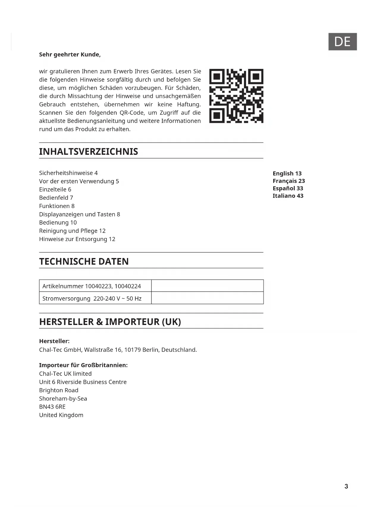 Sehr geehrter Kunde, wir gratulieren Ihnen zum Erwerb Ihres Gerätes. Lesen Sie die folgenden Hinweise sorgfältig durch und befolgen Sie diese, um möglichen Schäden vorzubeugen. Für Schäden, die durch Missachtung der Hinweise und unsachgemäßen Gebrauch entstehen, übernehmen wir keine Haftung. Scannen Sie den folgenden QR-Code, um Zugri auf die aktuellste Bedienungsanleitung und weitere Informationen rund um das Produkt zu erhalten. INHALTSVERZEICHNIS Sicherheitshinweise 4 Vor der ersten Verwendung 5 Einzelteile 6 Bedienfeld 7 Funktionen 8 Displayanzeigen und Tasten 8 Bedienung 10 Reinigung und Pege 12 Hinweise zur Entsorgung 12 TECHNISCHE DATEN Artikelnummer 10040223, 10040224 Stromversorgung 220-240 V ~ 50 Hz HERSTELLER & IMPORTEUR (UK) Hersteller: Chal-Tec GmbH, Wallstraße 16, 10179 Berlin, Deutschland. Importeur für Großbritannien: Chal-Tec UK limited Unit 6 Riverside Business Centre Brighton Road Shoreham-by-Sea BN43 6RE United Kingdom English 13 Français 23 Español 33 Italiano 434