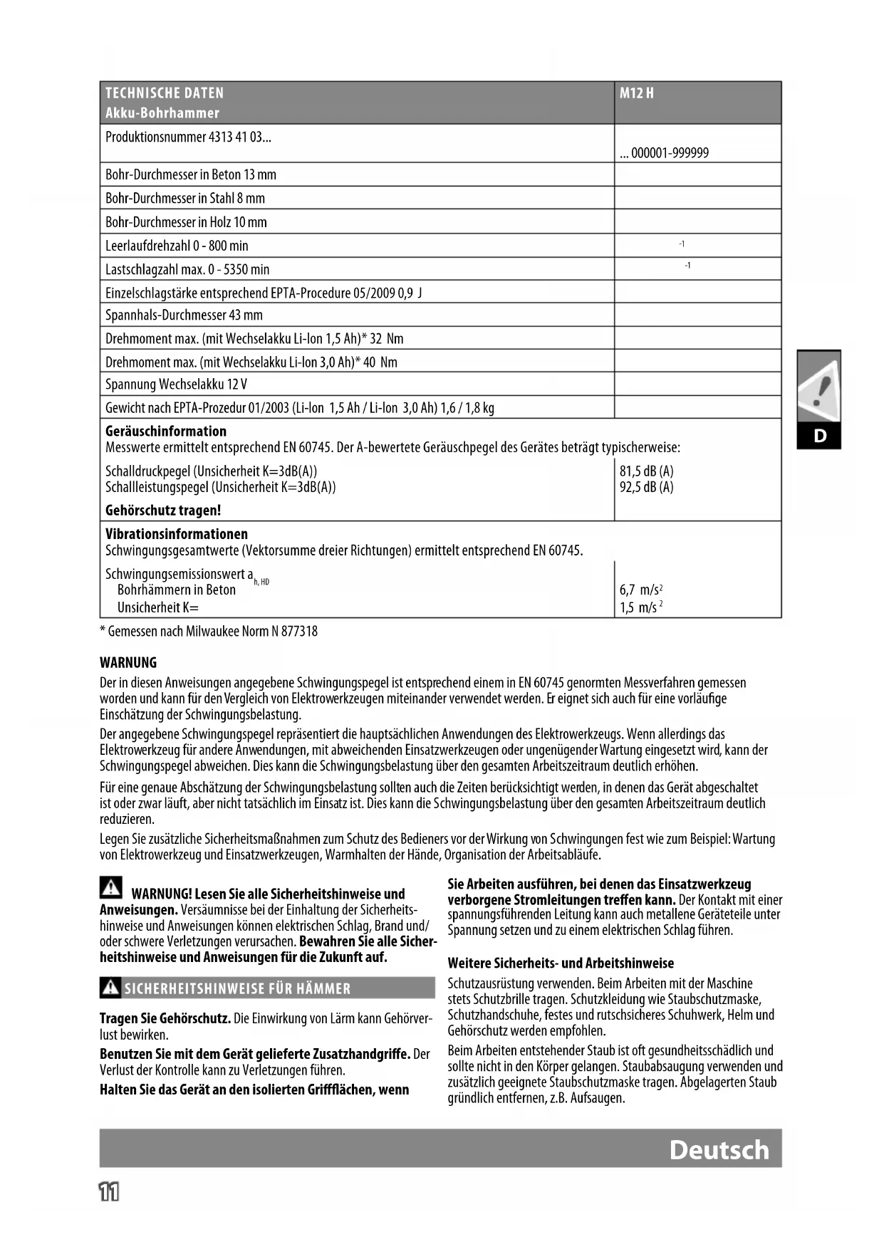 Tragen Sie Gehörschutz. Die Einwirkung von Lärm kann Gehörver- lust bewirken. Benutzen Sie mit dem Gerät gelieferte Zusatzhandgrie. Der Verlust der Kontrolle kann zu Verletzungen führen. Halten Sie das Gerät an den isolierten Griächen, wenn Sie Arbeiten ausführen, bei denen das Einsatzwerkzeug verborgene Stromleitungen treen kann. Der Kontakt mit einer spannungsführenden Leitung kann auch metallene Geräteteile unter Spannung setzen und zu einem elektrischen Schlag führen. Weitere Sicherheits- und Arbeitshinweise Schutzausrüstung verwenden. Beim Arbeiten mit der Maschine stets Schutzbrille tragen. Schutzkleidung wie Staubschutzmaske, Schutzhandschuhe, festes und rutschsicheres Schuhwerk, Helm und Gehörschutz werden empfohlen. Beim Arbeiten entstehender Staub ist oft gesundheitsschädlich und sollte nicht in den Körper gelangen. Staubabsaugung verwenden und zusätzlich geeignete Staubschutzmaske tragen. Abgelagerten Staub gründlich entfernen, z.B. Aufsaugen. TECHNISCHE DATEN Akku-Bohrhammer M12 H Produktionsnummer 4313 41 03... ... 000001-999999 Bohr-Durchmesser in Beton 13 mm Bohr-Durchmesser in Stahl 8 mm Bohr-Durchmesser in Holz 10 mm Leerlaufdrehzahl 0 - 800 min