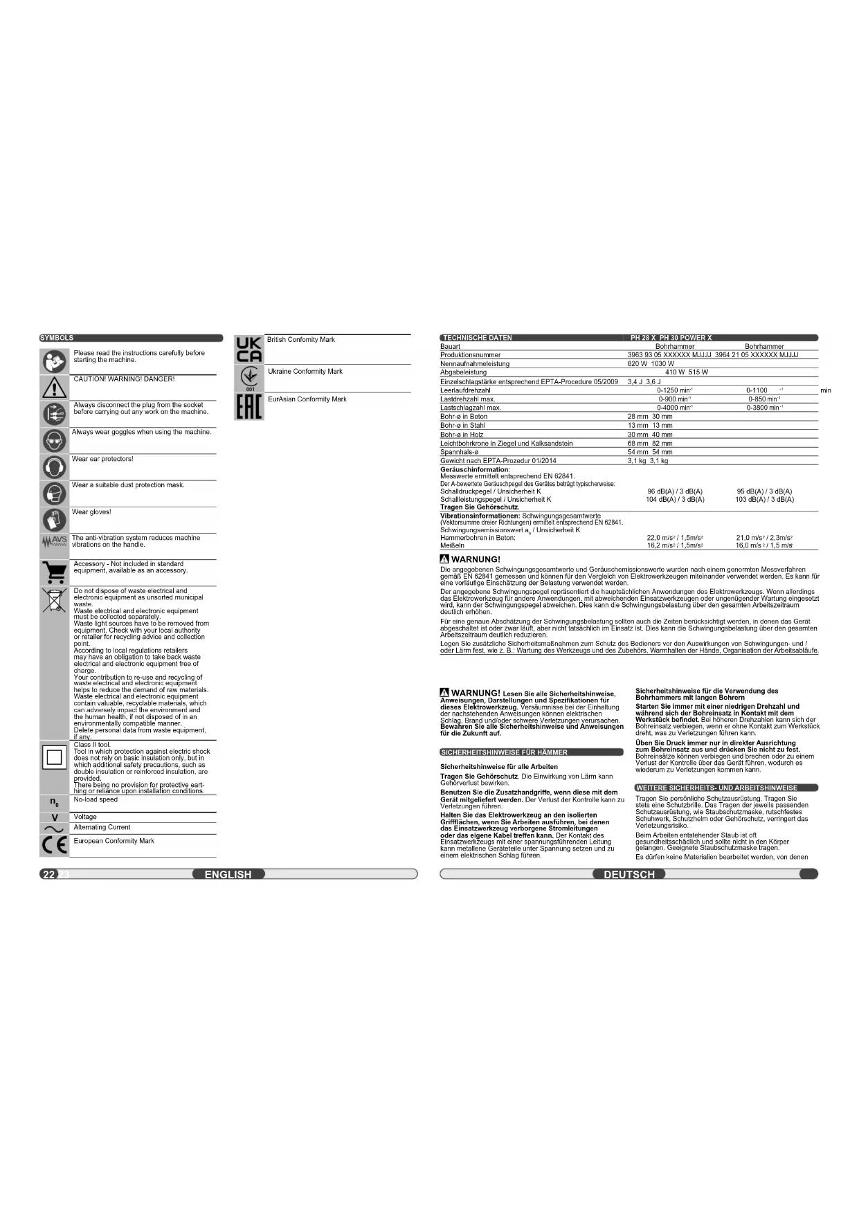 Tragen Sie persönliche Schutzausrüstung. Tragen Sie stets eine Schutzbrille. Das Tragen der jeweils passenden Schutzausrüstung, wie Staubschutzmaske, rutschfestes Schuhwerk, Schutzhelm oder Gehörschutz, verringert das Verletzungsrisiko. Beim Arbeiten entstehender Staub ist oft gesundheitsschädlich und sollte nicht in den Körper gelangen. Geeignete Staubschutzmaske tragen. Es dürfen keine Materialien bearbeitet werden, von denen WARNUNG! Die angegebenen Schwingungsgesamtwerte und Geräuschemissionswerte wurden nach einem genormten Messverfahren gemäß EN 62841 gemessen und können für den Vergleich von Elektrowerkzeugen miteinander verwendet werden. Es kann für eine vorläufi ge Einschätzung der Belastung verwendet werden. Der angegebene Schwingungspegel repräsentiert die hauptsächlichen Anwendungen des Elektrowerkzeugs. Wenn allerdings das Elektrowerkzeug für andere Anwendungen, mit abweichenden Einsatzwerkzeugen oder ungenügender Wartung eingesetzt wird, kann der Schwingungspegel abweichen. Dies kann die Schwingungsbelastung über den gesamten Arbeitszeitraum deutlich erhöhen. Für eine genaue Abschätzung der Schwingungsbelastung sollten auch die Zeiten berücksichtigt werden, in denen das Gerät abgeschaltet ist oder zwar läuft, aber nicht tatsächlich im Einsatz ist. Dies kann die Schwingungsbelastung über den gesamten Arbeitszeitraum deutlich reduzieren. Legen Sie zusätzliche Sicherheitsmaßnahmen zum Schutz des Bedieners vor den Auswirkungen von Schwingungen- und / oder Lärm fest, wie z. B.: Wartung des Werkzeugs und des Zubehörs, Warmhalten der Hände, Organisation der Arbeitsabläufe. Bohrhammer Bohrhammer British Confomity Mark Ukraine Conformity Mark EurAsian Conformity Mark24 25 eine Gesundheitsgefährdung ausgeht (z.B. Asbest). Beim Blockieren des Einsatzwerkzeuges bitte das Gerät sofort ausschalten! Schalten Sie das Gerät nicht wieder ein, solange das Einsatzwerkzeug blockiert ist; hierbei könnte ein Rückschlag mit hohem Reaktionsmoment entstehen. Ermitteln und beheben Sie die Ursache für die Blockierung des Einsatzwerkzeuges unter Berücksichtigung der Sicherheitshinweise. Mögliche Ursachen dafür können sein: