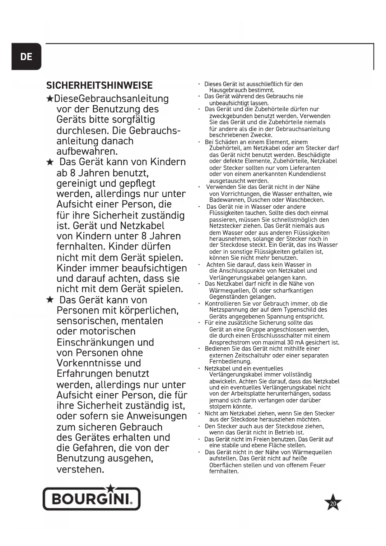 Die Garantie wird für die Dauer von zwei Jahren ab dem auf dem Kassenbon angegebenen Kaufdatum gewährt. Der Kassenbon gilt als Garantieschein. Sie können die Garantie bei dem Einzelhändler einlösen, bei dem Sie das Gerät gekauft haben. Die Garantie deckt keine Schäden, die durch falsche Nutzung, unsachgemäßes Auseinandernehmen, Fallenlassen, Stöße u. Ä. entstanden sind sowie Schäden an Geräten, die mit Wasser benutzt werden, die durch zu spätes Entkalken entstehen. Sofern bei einem bestimmten Produkt besondere Garantiebestimmungen angegeben werden, gelten diese vor den Allgemeinen Garantiebestimmungen. Die Garantie gilt nicht für Folgeschäden. Bei Fragen zur Anwendung des Produkts besuchen Sie bitte unsere Website: www.bourgini.com HAFTUNGSAUSSCHLUSS Änderungen vorbehalten; Produktspezifikationen können ohne Angabe von Gründen geändert werden. DE25 DE26
