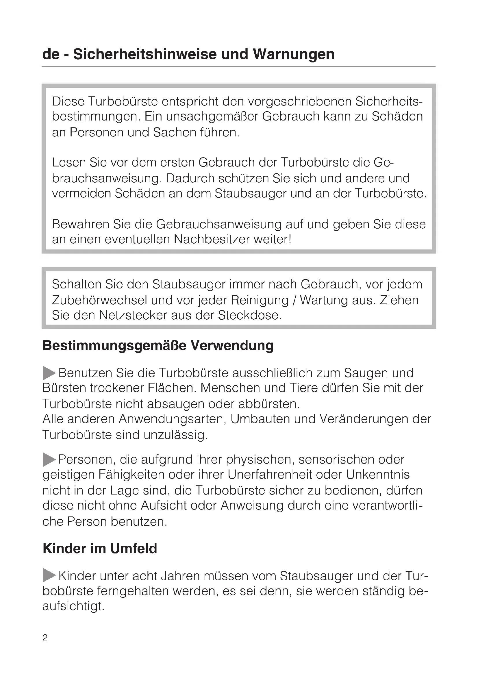 Benutzen Sie die Turbobürste ausschließlich zum Saugen und Bürsten trockener Flächen. Menschen und Tiere dürfen Sie mit der Turbobürste nicht absaugen oder abbürsten. Alle anderen Anwendungsarten, Umbauten und Veränderungen der Turbobürste sind unzulässig.