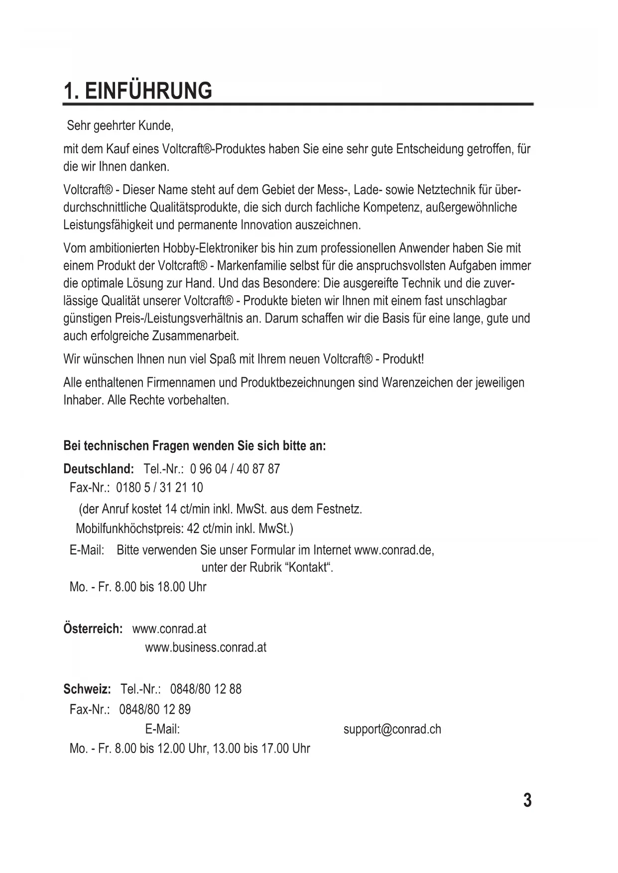 Sehr geehrter Kunde, mit dem Kauf eines Voltcraft®-Produktes haben Sie eine sehr gute Entscheidung getroffen, für die wir Ihnen danken. Voltcraft® - Dieser Name steht auf dem Gebiet der Mess-, Lade- sowie Netztechnik für über- durchschnittliche Qualitätsprodukte, die sich durch fachliche Kompetenz, außergewöhnliche Leistungsfähigkeit und permanente Innovation auszeichnen. Vom ambitionierten Hobby-Elektroniker bis hin zum professionellen Anwender haben Sie mit einem Produkt der Voltcraft® - Markenfamilie selbst für die anspruchsvollsten Aufgaben immer die optimale Lösung zur Hand. Und das Besondere: Die ausgereifte Technik und die zuver- lässige Qualität unserer Voltcraft® - Produkte bieten wir Ihnen mit einem fast unschlagbar günstigen Preis-/Leistungsverhältnis an. Darum schaffen wir die Basis für eine lange, gute und auch erfolgreiche Zusammenarbeit. Wir wünschen Ihnen nun viel Spaß mit Ihrem neuen Voltcraft® - Produkt! Alle enthaltenen Firmennamen und Produktbezeichnungen sind Warenzeichen der jeweiligen Inhaber. Alle Rechte vorbehalten. Bei technischen Fragen wenden Sie sich bitte an: Deutschland: Tel.-Nr.: 0 96 04 / 40 87 87 Fax-Nr.: 0180 5 / 31 21 10 (der Anruf kostet 14 ct/min inkl. MwSt. aus dem Festnetz. Mobilfunkhöchstpreis: 42 ct/min inkl. MwSt.) E-Mail: Bitte verwenden Sie unser Formular im Internet www.conrad.de, unter der Rubrik “Kontakt“. Mo. - Fr. 8.00 bis 18.00 Uhr Österreich: www.conrad.at www.business.conrad.at Schweiz: Tel.-Nr.: 0848/80 12 88 Fax-Nr.: 0848/80 12 89 E-Mail: support@conrad.ch Mo. - Fr. 8.00 bis 12.00 Uhr, 13.00 bis 17.00 Uhr4