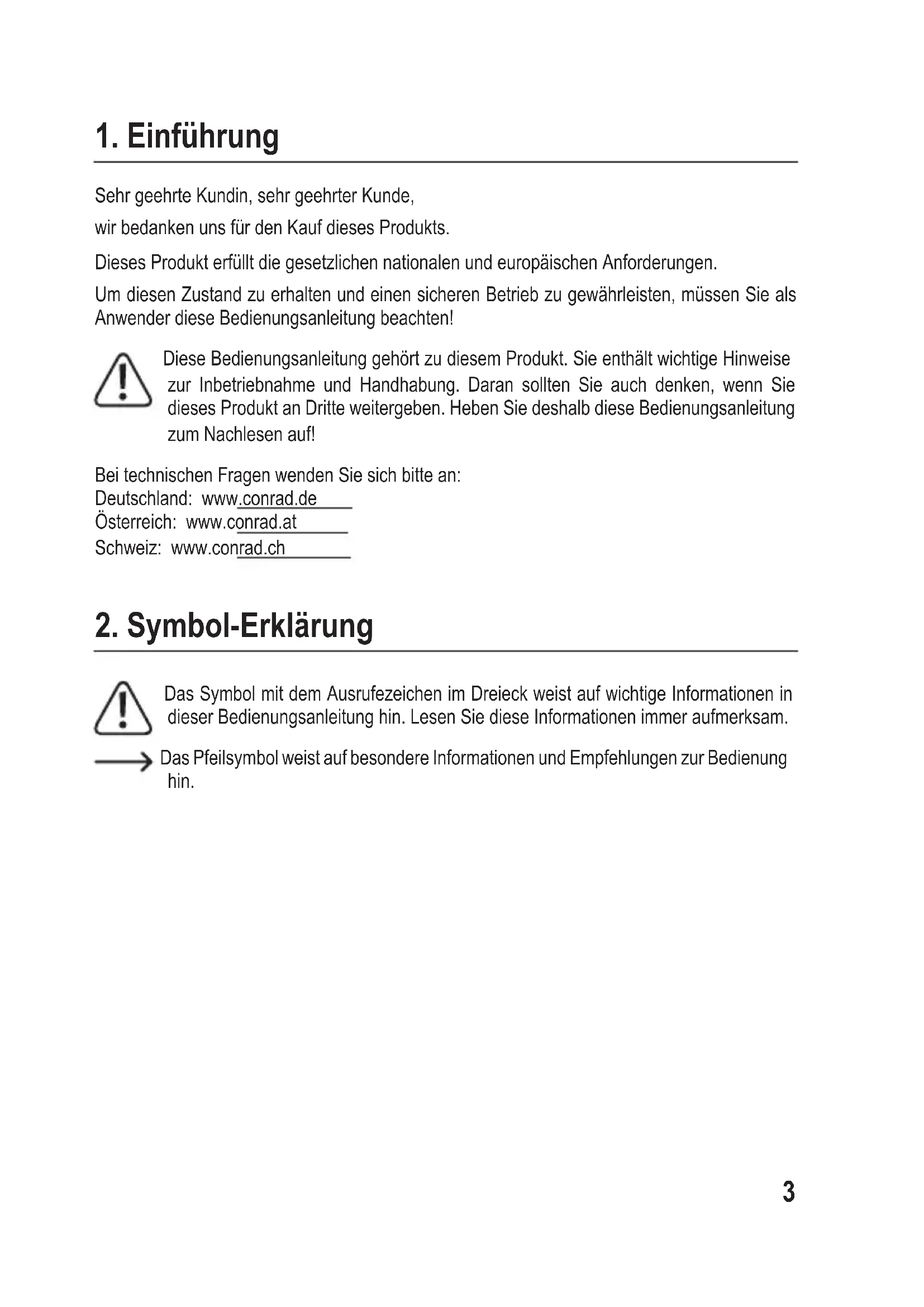 Sehr geehrte Kundin, sehr geehrter Kunde, wir bedanken uns für den Kauf dieses Produkts. Dieses Produkt erfüllt die gesetzlichen nationalen und europäischen Anforderungen. Um diesen Zustand zu erhalten und einen sicheren Betrieb zu gewährleisten, müssen Sie als Anwender diese Bedienungsanleitung beachten! Diese Bedienungsanleitung gehört zu diesem Produkt. Sie enthält wichtige Hinweise zur Inbetriebnahme und Handhabung. Daran sollten Sie auch denken, wenn Sie dieses Produkt an Dritte weitergeben. Heben Sie deshalb diese Bedienungsanleitung zum Nachlesen auf! Bei technischen Fragen wenden Sie sich bitte an: Deutschland: www.conrad.de Österreich: www.conrad.at Schweiz: www.conrad.ch
