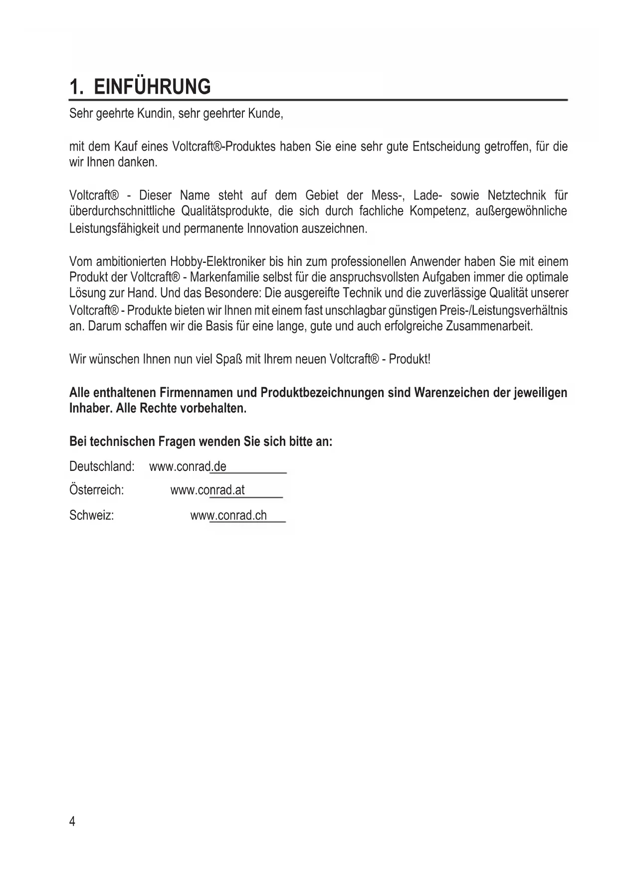 Sehr geehrte Kundin, sehr geehrter Kunde, mit dem Kauf eines Voltcraft®-Produktes haben Sie eine sehr gute Entscheidung getroffen, für die wir Ihnen danken. Voltcraft® - Dieser Name steht auf dem Gebiet der Mess-, Lade- sowie Netztechnik für überdurchschnittliche Qualitätsprodukte, die sich durch fachliche Kompetenz, außergewöhnliche Leistungsfähigkeit und permanente Innovation auszeichnen. Vom ambitionierten Hobby-Elektroniker bis hin zum professionellen Anwender haben Sie mit einem Produkt der Voltcraft® - Markenfamilie selbst für die anspruchsvollsten Aufgaben immer die optimale Lösung zur Hand. Und das Besondere: Die ausgereifte Technik und die zuverlässige Qualität unserer Voltcraft® - Produkte bieten wir Ihnen mit einem fast unschlagbar günstigen Preis-/Leistungsverhältnis an. Darum schaffen wir die Basis für eine lange, gute und auch erfolgreiche Zusammenarbeit. Wir wünschen Ihnen nun viel Spaß mit Ihrem neuen Voltcraft® - Produkt! Alle enthaltenen Firmennamen und Produktbezeichnungen sind Warenzeichen der jeweiligen Inhaber. Alle Rechte vorbehalten. Bei technischen Fragen wenden Sie sich bitte an: Deutschland: www.conrad.de Österreich: www.conrad.at Schweiz: www.conrad.ch5