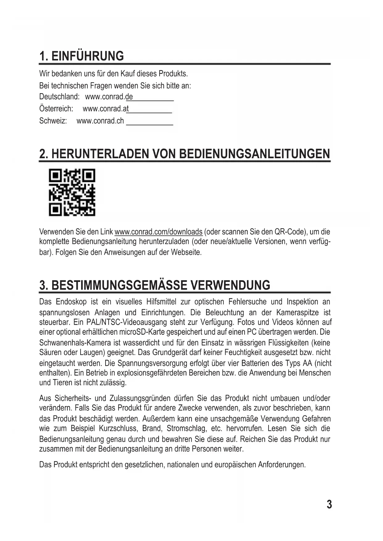 Das Endoskop ist ein visuelles Hilfsmittel zur optischen Fehlersuche und Inspektion an spannungslosen Anlagen und Einrichtungen. Die Beleuchtung an der Kameraspitze ist steuerbar. Ein PAL/NTSC-Videoausgang steht zur Verfügung. Fotos und Videos können auf einer optional erhältlichen microSD-Karte gespeichert und auf einen PC übertragen werden. Die Schwanenhals-Kamera ist wasserdicht und für den Einsatz in wässrigen Flüssigkeiten (keine Säuren oder Laugen) geeignet. Das Grundgerät darf keiner Feuchtigkeit ausgesetzt bzw. nicht eingetaucht werden. Die Spannungsversorgung erfolgt über vier Batterien des Typs AA (nicht enthalten). Ein Betrieb in explosionsgefährdeten Bereichen bzw. die Anwendung bei Menschen und Tieren ist nicht zulässig. Aus Sicherheits- und Zulassungsgründen dürfen Sie das Produkt nicht umbauen und/oder verändern. Falls Sie das Produkt für andere Zwecke verwenden, als zuvor beschrieben, kann das Produkt beschädigt werden. Außerdem kann eine unsachgemäße Verwendung Gefahren wie zum Beispiel Kurzschluss, Brand, Stromschlag, etc. hervorrufen. Lesen Sie sich die Bedienungsanleitung genau durch und bewahren Sie diese auf. Reichen Sie das Produkt nur zusammen mit der Bedienungsanleitung an dritte Personen weiter. Das Produkt entspricht den gesetzlichen, nationalen und europäischen Anforderungen.4