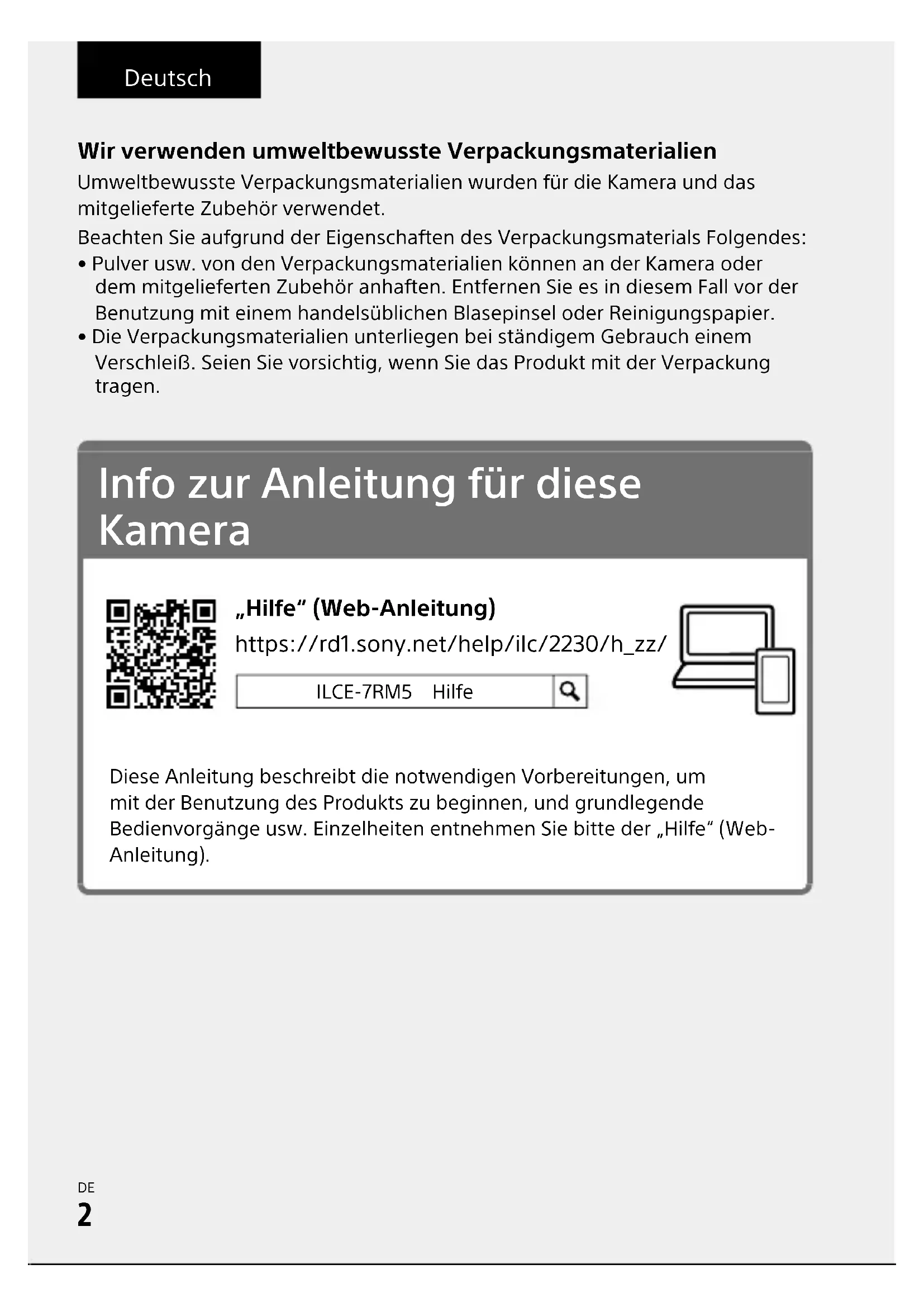 \\win-473\CAMERA\CreatorsApp_SG_kaihan_Hubpage\Multi\2_Compose\2_CX89200(GL)\Printed in Thailand-STT\5043817421_14lang\5043817421ILCE7RM5CEC\03DE-ILCE7RM5CEC\03DE.indd DTP data saved: 2023/04/12 17:38 PDF file created: 2023/04/12 17:39 Deutsch Wir verwenden umweltbewusste Verpackungsmaterialien Umweltbewusste Verpackungsmaterialien wurden für die Kamera und das mitgelieferte Zubehör verwendet.Beachten Sie aufgrund der Eigenschaften des Verpackungsmaterials Folgendes:• Pulver usw. von den Verpackungsmaterialien können an der Kamera oder dem mitgelieferten Zubehör anhaften. Entfernen Sie es in diesem Fall vor der Benutzung mit einem handelsüblichen Blasepinsel oder Reinigungspapier.• Die Verpackungsmaterialien unterliegen bei ständigem Gebrauch einem Verschleiß. Seien Sie vorsichtig, wenn Sie das Produkt mit der Verpackung tragen. Info zur Anleitung für diese Kamera https://rd1.sony.net/help/ilc/2230/h_zz/ „Hilfe“ (Web-Anleitung) ILCE-7RM5 HilfeDiese Anleitung beschreibt die notwendigen Vorbereitungen, um mit der Benutzung des Produkts zu beginnen, und grundlegende Bedienvorgänge usw. Einzelheiten entnehmen Sie bitte der „Hilfe“ (Web-Anleitung).ILCE-7RM55-043-817-42(1)