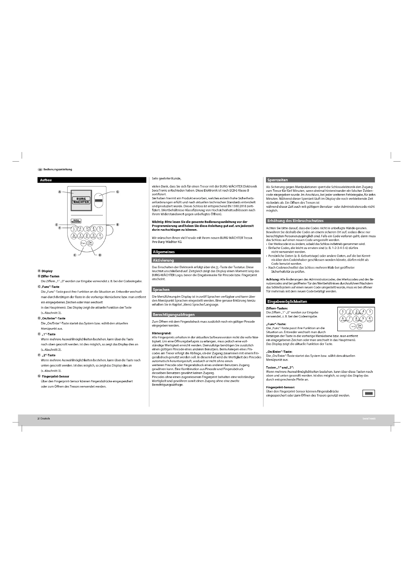 Altenhofer Weg 15 58300 Wetter GermanySecuTronic 2 I Deutsch Display Zier-Tasten Die Ziern „1“-„0“ werden zur Eingabe verwendet z. B. bei der Codeeingabe. „Func“-Taste Die „Func“-Taste passt ihre Funktion an die Situation an. Entweder wechselt man durch Betätigen der Taste in die vorherige Menüebene bzw. man entfernt ein eingegebenes Zeichen oder man wechselt in das Hauptmenü. Das Display zeigt die aktuelle Funktion der Taste (s. Abschnitt 3). „On/Enter“-Taste Die „On/Enter“-Taste startet das System bzw. wählt den aktuellen Menüpunkt aus. „1“-Taste Wenn mehrere Auswahlmöglichkeiten bestehen, kann über die Taste nach oben gescrollt werden. Ist dies möglich, so zeigt das Display dies an (s. Abschnitt 3). „2“-Taste Wenn mehrere Auswahlmöglichkeiten bestehen, kann über die Taste nach unten gescrollt werden. Ist dies möglich, so zeigt das Display dies an (s. Abschnitt 3). Fingerprint-Sensor Über den Fingerprint-Sensor können Fingerabdrücke eingespeichert oder zum Önen des Tresors verwendet werden. Aufbau Bedienungsanleitung Sehr geehrter Kunde, vielen Dank, dass Sie sich für einen Tresor mit der BURG-WÄCHTER Elektronik SecuTronic entschieden haben. Diese Elektronik ist nach ECB•S Klasse B zertiziert. Sie haben hiermit ein Produkt erworben, welches extrem hohe Sicherheits- anforderungen erfüllt und nach aktuellen technischen Standards entwickelt und produziert wurde. Dieses Schloss ist entsprechend EN 1300:2018 zerti- ziert. (Wertbehältnisse-Klassizierung von Hochsicherheitsschlössern nach ihrem Widerstandswert gegen unbefugtes Önen). Wichtig: Bitte lesen Sie die gesamte Bedienungsanleitung vor der Programmierung und heben Sie diese Anleitung gut auf, um jederzeit darin nachschlagen zu können. Wir wünschen Ihnen viel Freude mit Ihrem neuen BURG-WÄCHTER Tresor. Ihre Burg-Wächter KG Aktivierung Sprachen Das Einschalten der Elektronik erfolgt über die