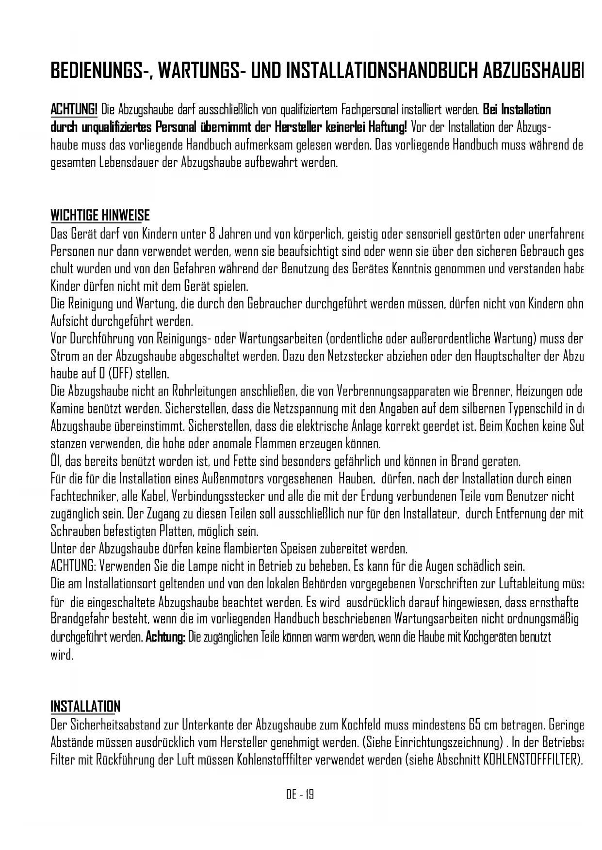 ACHTUNG! Die Abzugshaube darf ausschließlich von qualifiziertem Fachpersonal installiert werden. Bei Installation durch unqualifiziertes Personal übernimmt der Hersteller keinerlei Haftung! Vor der Installation der Abzugs- haube muss das vorliegende Handbuch aufmerksam gelesen werden. Das vorliegende Handbuch muss während der gesamten Lebensdauer der Abzugshaube aufbewahrt werden.