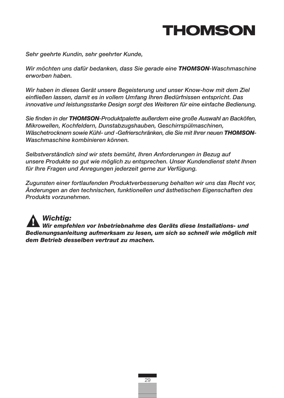 Sehr geehrte Kundin, sehr geehrter Kunde, Wir möchten uns dafür bedanken, dass Sie gerade eine THOMSON-Waschmaschine erworben haben. Wir haben in dieses Gerät unsere Begeisterung und unser Know-how mit dem Ziel einfließen lassen, damit es in vollem Umfang Ihren Bedürfnissen entspricht. Das innovative und leistungsstarke Design sorgt des Weiteren für eine einfache Bedienung. Sie finden in der THOMSON-Produktpalette außerdem eine große Auswahl an Backöfen, Mikrowellen, Kochfeldern, Dunstabzugshauben, Geschirrspülmaschinen, Wäschetrocknern sowie Kühl- und -Gefrierschränken, die Sie mit Ihrer neuen THOMSONWaschmaschine kombinieren können. Selbstverständich sind wir stets bemüht, Ihren Anforderungen in Bezug auf unsere Produkte so gut wie möglich zu entsprechen. Unser Kundendienst steht Ihnen für Ihre Fragen und Anregungen jederzeit gerne zur Verfügung. Zugunsten einer fortlaufenden Produktverbesserung behalten wir uns das Recht vor, Änderungen an den technischen, funktionellen und ästhetischen Eigenschaften des Produkts vorzunehmen. Wichtig: Wir empfehlen vor Inbetriebnahme des Geräts diese Installations- und Bedienungsanleitung aufmerksam zu lesen, um sich so schnell wie möglich mit dem Betrieb desselben vertraut zu machen.
