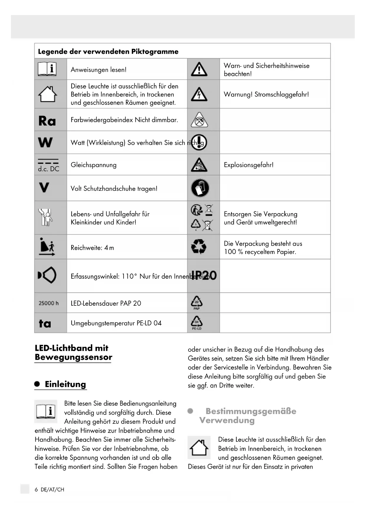 Umgebungstemperatur PE-LD 04 LED-Lichtband mit Bewegungssensor Einleitung Bitte lesen Sie diese Bedienungsanleitung vollständig und sorgfältig durch. Diese Anleitung gehört zu diesem Produkt und enthält wichtige Hinweise zur Inbetriebnahme und Handhabung. Beachten Sie immer alle Sicherheits- hinweise. Prüfen Sie vor der Inbetriebnahme, ob die korrekte Spannung vorhanden ist und ob alle Teile richtig montiert sind. Sollten Sie Fragen haben oder unsicher in Bezug auf die Handhabung des Gerätes sein, setzen Sie sich bitte mit Ihrem Händler oder der Servicestelle in Verbindung. Bewahren Sie diese Anleitung bitte sorgfältig auf und geben Sie sie ggf. an Dritte weiter. Bestimmungsgemäße Verwendung Diese Leuchte ist ausschließlich für den Betrieb im Innenbereich, in trockenen und geschlossenen Räumen geeignet. Dieses Gerät ist nur für den Einsatz in privaten Einleitung / SicherheitEinleitung7 DE/AT/CH Haushalten und nicht für den kommerziellen Ge- brauch vorgesehen. Eine andere Verwendung als zuvor beschrieben ist nicht zulässig und führt zur Beschädigung dieses Produktes. Darüber hinaus ist dies mit Gefahren, wie z. B. Kurzschluss, Brand elek- trischem Schlag etc. verbunden. Verwenden Sie diese Leuchte nicht als Nachtlicht. Dieses Produkt ist vorgesehen für den normalen Gebrauch. Lieferumfang Kontrollieren Sie unmittelbar nach dem Auspacken immer den Lieferumfang auf Vollständigkeit sowie den einwandfreien Zustand des Gerätes. 1 LED-Band 1 Klebestreifen 4 Batterien 1,5 V AAA 1 Montage- und Bedienungsanleitung Teilebeschreibung
