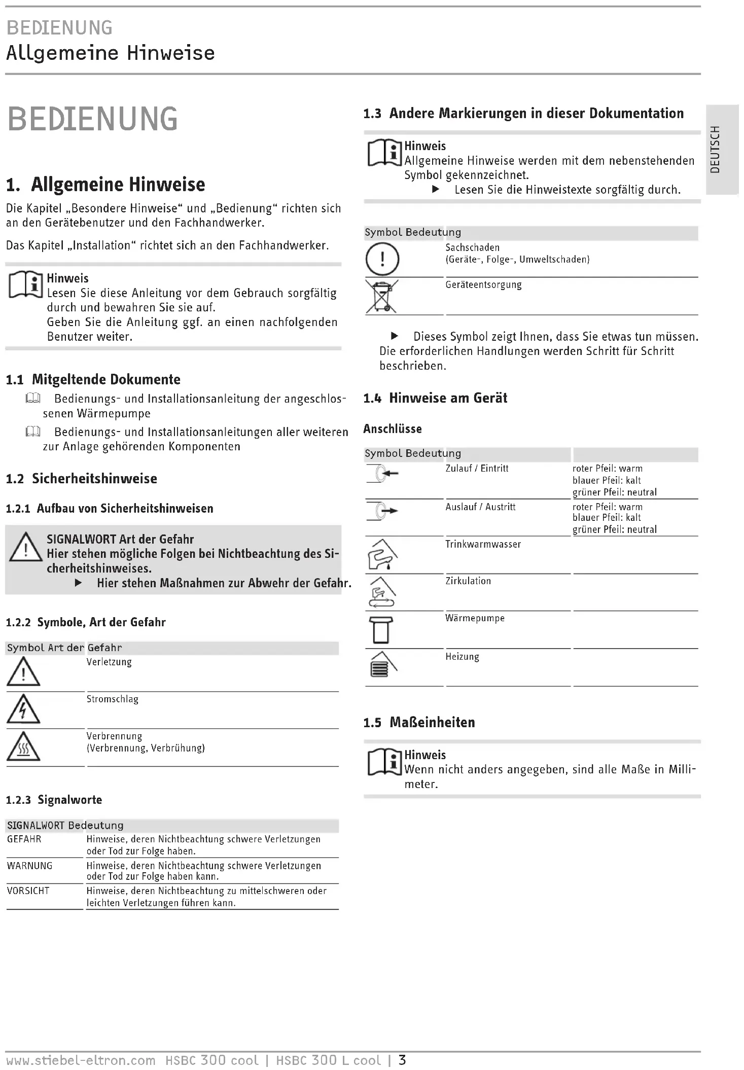 IntegralspeicherBEDIENUNG Allgemeine Hinweise DEUTSCH www.stiebel-eltron.com HSBC 300 cool | HSBC 300 L cool | 3 BEDIENUNG