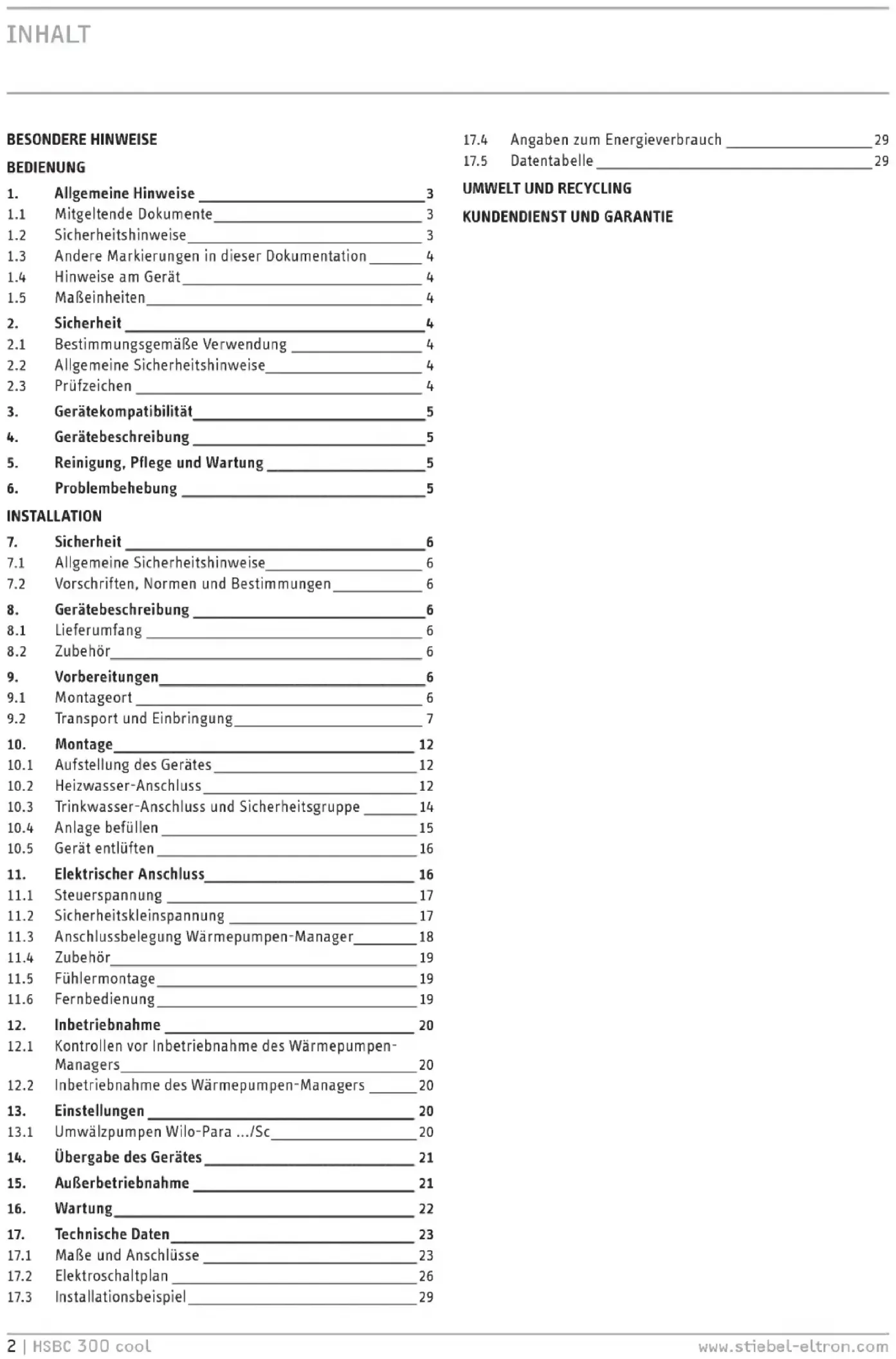 Ausführungen Geeignet für ...SBC 300 cool/plus, 300 l cool/plus, STI-0 270 Pumpenbaugruppe HSBC 3-HKM HSBC 3-HKM 238825 Anschlüsse Anschluss Heizkreis mm 22 Vsy ► Wenn auf dem Gerät eine durchgestrichene NtT Mülltonne abgebildet ist, bringen Sie das A (j\ Gerät zur Wiederverwendung und Verwer¬ tung zu den kommunalen Sammelstellen oder Rücknahmestellen des Handels. Dieses Dokument besteht aus recyclebarem Papier. ► Entsorgen Sie das Dokument nach dem Le- PAP benszyklus des Gerätes gemäß den nationa¬ len Vorschriften. Entsorgung innerhalb Deutschlands ► Überlassen Sie die Transportverpackung dem beim Fachhandwerk bzw. Fachhandel von uns eingerichte¬ ten Rücknahme- und Entsorgungssystem. ► Entsorgen Sie Verkaufsverpackungen über eines der Dualen Systeme (z. B. die kommunale Sammlung „gelbe Säcke“ / „gelbe Tonne“) in Deutschland. ► Geräte aus privaten Haushalten, die unter das Elektro- und Elektronikgerätegesetz (ElektroG) fallen, können Sie kostenlos bei kommunalen Sammelstellen oder Rücknahmestellen des Handels abgeben. ► Geben Sie Batterien an den Handel oder an von öf¬ fentlich-rechtlichen Entsorgungsträgern eingerichteten Rückgabestellen (z. B. Schadstoffmobile und Recyc¬ linghöfe) zurück. Entsorgung außerhalb Deutschlands ► Entsorgen Sie die Geräte und Materialien nach den örtlich geltenden Vorschriften und Gesetzen. 30 I HSBC 300 cool www.stiebel-eltron.comKUNDENDIENST UND GARANTIE Erreichbarkeit Sollte einmal eine Störung an einem unserer Produkte auftreten, stehen wir Ihnen natürlich mit Rat und Tat zur Seite. Rufen Sie uns an: 05531 702-111 oder schreiben Sie uns: Stiebel Eltron GmbH & Co. KG - Kundendienst - Dr.-Stiebel-Str. 33, 37603 Holzminden E-Mail: kundendienst@stiebel-eltron.de Fax: 05531 702-95890 Weitere Anschriften sind auf der letzten Seite aufgeführt. Unseren Kundendienst erreichen Sie telefonisch rund
