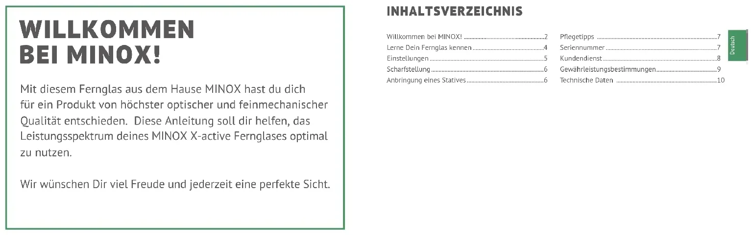 - Technische Daten Mit diesem Fernglas aus dem Hause MINOX hast du dich für ein Produkt von höchster optischer und feinmechanischer Qualität entschieden. Diese Anleitung soll dir helfen, das Leistungsspektrum deines MINOX X-active Fernglases optimal zu nutzen. Wir wünschen Dir viel Freude und jederzeit eine perfekte Sicht.Deutsch p. 10