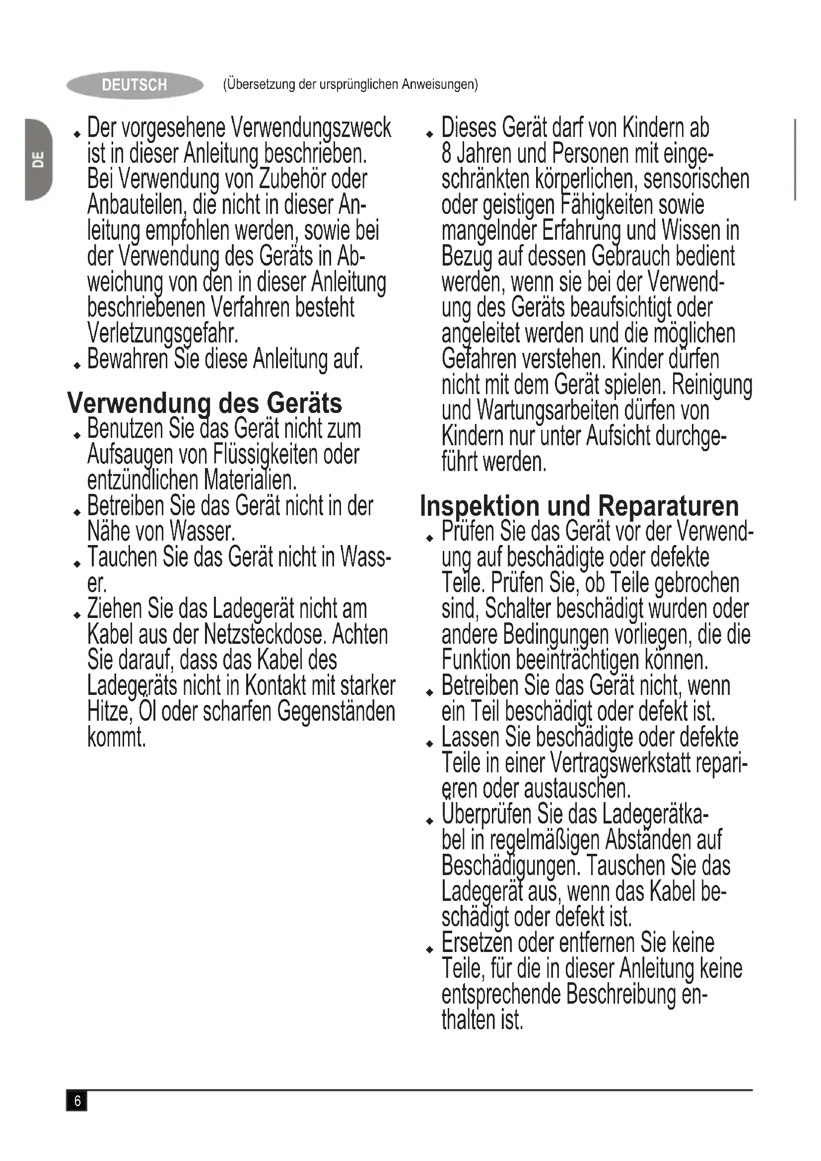 Lesen Sie diese Anleitung vollständig und aufmerksam durch, bevor Sie das Gerät zum ersten Mal verwenden.6 (Übersetzung der ursprünglichen Anweisungen) DEUTSCH