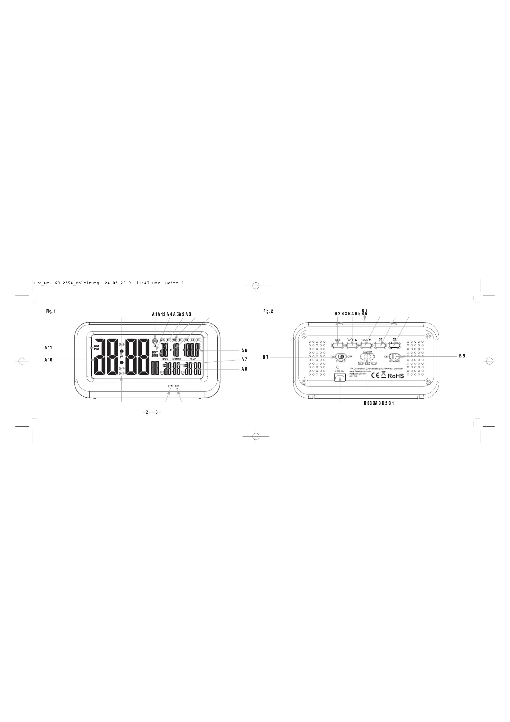 A: LCD-Anzeige (Fig. 1): A 1: Funksignal-Symbol A 2: Sommerzeit-Symbol A 3: Zeitzone A 4: Wochentag A 5: Datum A 6: Innentemperatur A 7: Alarmzeit 1 mit Alarmsymbol A 8: Alarmzeit 2 mit Alarmsymbol A 9: Weckrhythmus A 10: Uhrzeit mit Sekunden A 11: AM/PM bei 12-Stunden-Format A 12: Snooze-Symbol B: Tasten (Fig. 2): B 1: SNOOZE/LIGHT Taste B 2: SET Taste B 3: °C/°F/