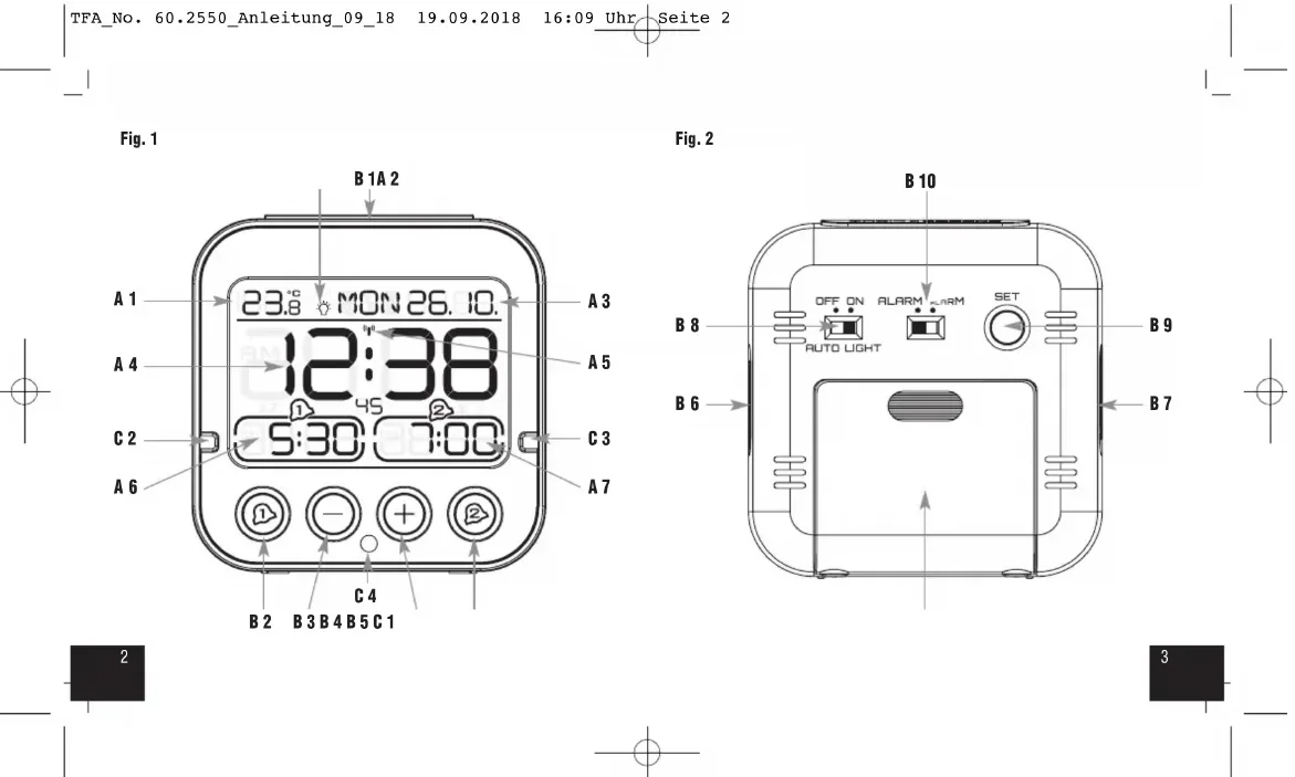 A 3: Wochentag, Datum A 4: Uhrzeit, Sekunden A 5: DCF-Symbol (aktiviert) A 6: Alarmzeit 1 (aktiviert) A 7: Alarmzeit 2 (aktiviert) B: Tasten (Fig. 1-2): B 1: SNOOZE/LIGHT Taste B 2: Taste B 3: – Taste B 4: + Taste B 5: Taste B 6: Alarmzeit 1 ON/OFF Schiebeschalter B 7: Alarmzeit 2 ON/OFF Schiebeschalter B 8: AUTO LIGHT ON/OFF Schiebeschalter B 9: SET Taste B 10: ALARM / ALARM Schiebeschalter C: Gehäuse (Fig. 1-2): C 1: Batteriefach C 2: Farbmarke Alarmzeit 1 AN/AUS C 3: Farbmarke Alarmzeit 2 AN/AUS C 4: Lichtsensor