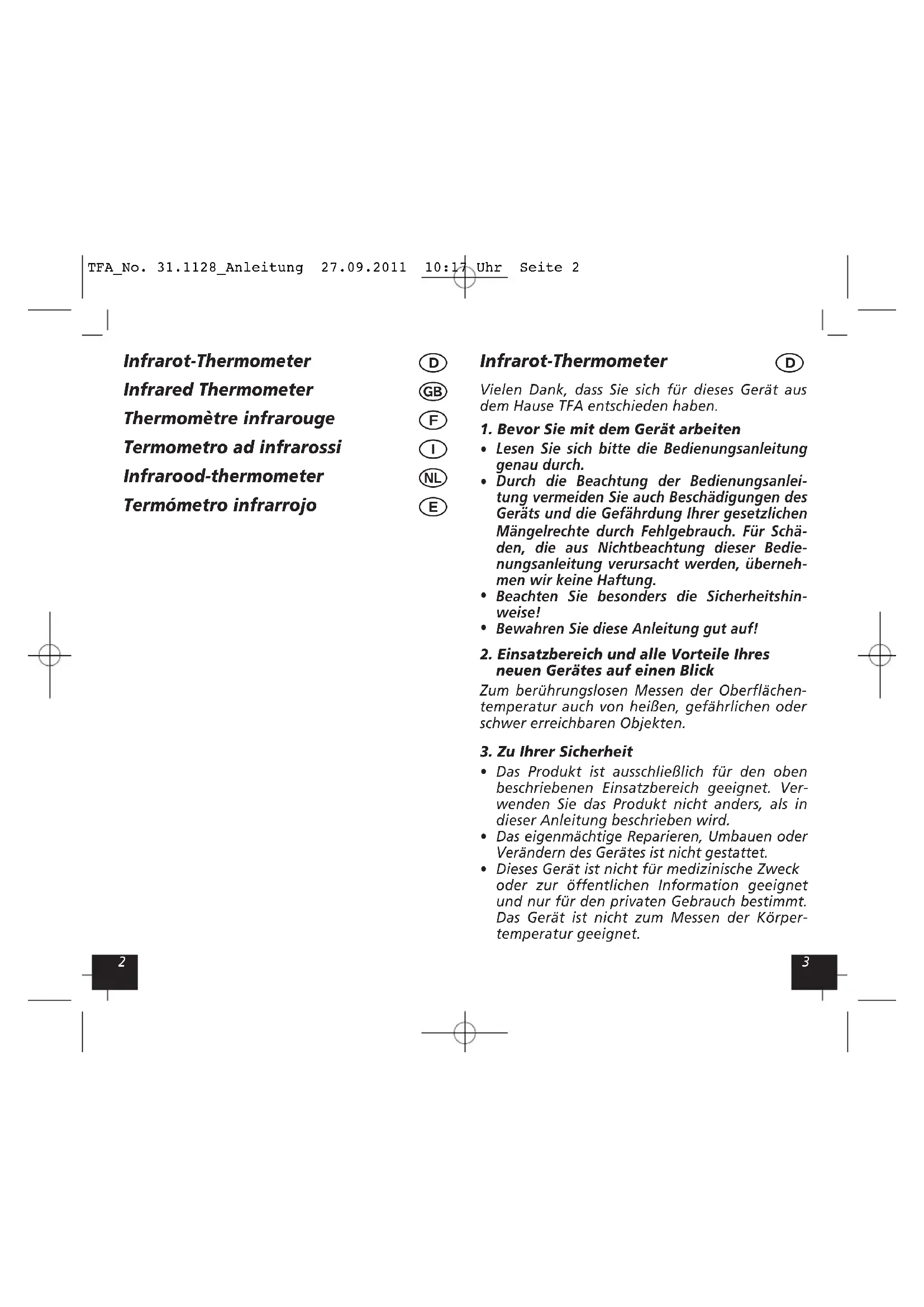 Dieses Gerät ist nicht für medizinische Zweck oder zur öffentlichen Information geeignet und nur für den privaten Gebrauch bestimmt. Das Gerät ist nicht zum Messen der Körper- temperatur geeignet. TFA_No. 31.1128_Anleitung 27.09.2011 10:17 Uhr Seite 254 Infrarot-Thermometer