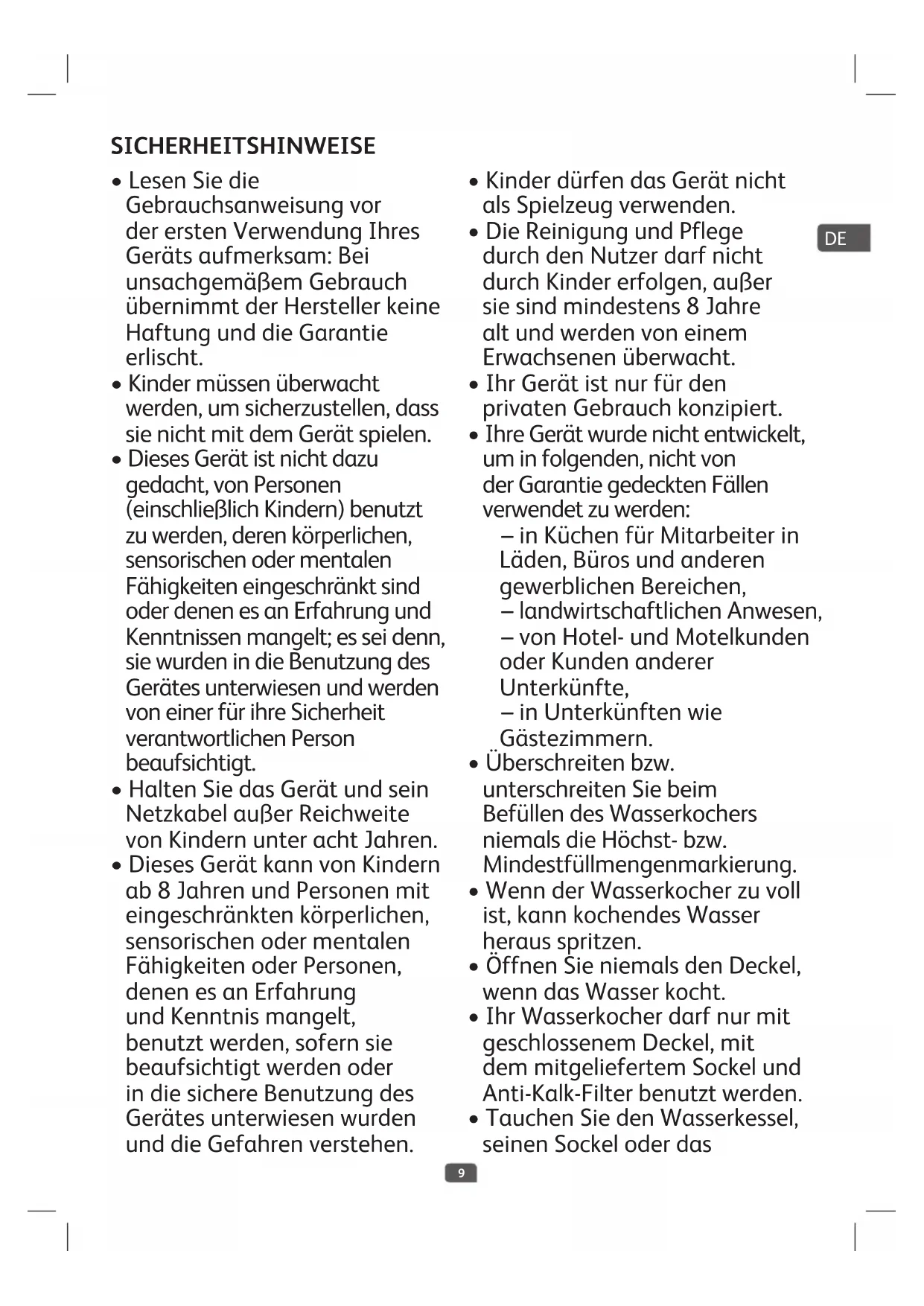 - Tauchen Sie den Wasserkessel, seinen Sockel oder das SICHERHEITSHINWEISE DE10 Stromkabel und den Stecker nicht in Wasser oder andere Flüssigkeiten.