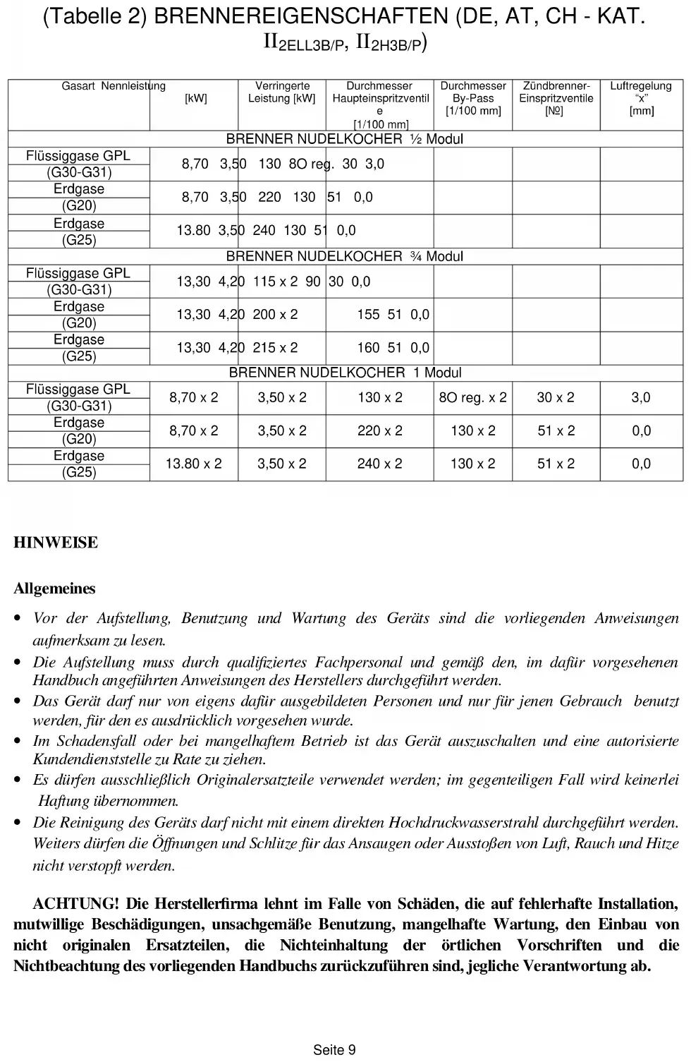 - Die Reinigung des Geräts darf nicht mit einem direkten Hochdruckwasserstrahl durchgeführt werden. Weiters dürfen die Öffnungen und Schlitze für das Ansaugen oder Ausstoßen von Luft, Rauch und Hitze nicht verstopft werden. ACHTUNG! Die Herstellerfirma lehnt im Falle von Schäden, die auf fehlerhafte Installation, mutwillige Beschädigungen, unsachgemäße Benutzung, mangelhafte Wartung, den Einbau von nicht originalen Ersatzteilen, die Nichteinhaltung der örtlichen Vorschriften und die Nichtbeachtung des vorliegenden Handbuchs zurückzuführen sind, jegliche Verantwortung ab.Seite 10 Für den Installateur