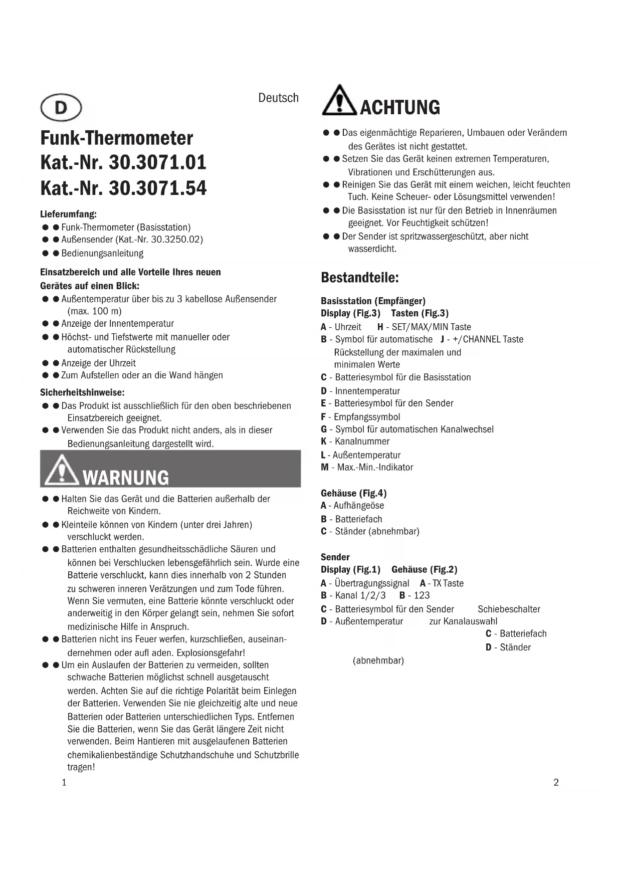 MDeutsch Funk-Thermometer Kat.-Nr. 30.3071.01 Kat.-Nr. 30.3071.54 Lieferumfang: Funk-Thermometer (Basisstation) Außensender (Kat.-Nr. 30.3250.02) Bedienungsanleitung Einsatzbereich und alle Vorteile Ihres neuen Gerätes auf einen Blick: Außentemperatur über bis zu 3 kabellose Außensender (max. 100 m) Anzeige der Innentemperatur Höchst- und Tiefstwerte mit manueller oder automatischer Rückstellung Anzeige der Uhrzeit Zum Aufstellen oder an die Wand hängen Sicherheitshinweise: Das Produkt ist ausschließlich für den oben beschriebenen Einsatzbereich geeignet. Verwenden Sie das Produkt nicht anders, als in dieser Bedienungsanleitung dargestellt wird. WARNUNG Halten Sie das Gerät und die Batterien außerhalb der Reichweite von Kindern. Kleinteile können von Kindern (unter drei Jahren) verschluckt werden. Batterien enthalten gesundheitsschädliche Säuren und können bei Verschlucken lebensgefährlich sein. Wurde eine Batterie verschluckt, kann dies innerhalb von 2 Stunden zu schweren inneren Verätzungen und zum Tode führen. Wenn Sie vermuten, eine Batterie könnte verschluckt oder anderweitig in den Körper gelangt sein, nehmen Sie sofort medizinische Hilfe in Anspruch. Batterien nicht ins Feuer werfen, kurzschließen, auseinan- dernehmen oder aufl aden. Explosionsgefahr! Um ein Auslaufen der Batterien zu vermeiden, sollten schwache Batterien möglichst schnell ausgetauscht werden. Achten Sie auf die richtige Polarität beim Einlegen der Batterien. Verwenden Sie nie gleichzeitig alte und neue Batterien oder Batterien unterschiedlichen Typs. Entfernen Sie die Batterien, wenn Sie das Gerät längere Zeit nicht verwenden. Beim Hantieren mit ausgelaufenen Batterien chemikalienbeständige Schutzhandschuhe und Schutzbrille tragen! ACHTUNG Das eigenmächtige Reparieren, Umbauen oder Verändern des Gerätes ist nicht gestattet. Setzen Sie das Gerät keinen extremen Temperaturen, Vibrationen und Erschütterungen aus. Reinigen Sie das Gerät mit einem weichen, leicht feuchten Tuch. Keine Scheuer- oder Lösungsmittel verwenden! Die Basisstation ist nur für den Betrieb in Innenräumen geeignet. Vor Feuchtigkeit schützen! Der Sender ist spritzwassergeschützt, aber nicht wasserdicht. Bestandteile: Basisstation (Empfänger) Display (Fig.3) Tasten (Fig.3) A - Uhrzeit H - SET/MAX/MIN Taste B - Symbol für automatische J - +/CHANNEL Taste Rückstellung der maximalen und minimalen Werte C - Batteriesymbol für die Basisstation D - Innentemperatur E - Batteriesymbol für den Sender F - Empfangssymbol G - Symbol für automatischen Kanalwechsel K - Kanalnummer L - Außentemperatur M - Max.-Min.-Indikator Gehäuse (Fig.4) A - Aufhängeöse B - Batteriefach C - Ständer (abnehmbar) Sender Display (Fig.1) Gehäuse (Fig.2) A - Übertragungssignal A - TX Taste B - Kanal 1/2/3 B - 123 C - Batteriesymbol für den Sender Schiebeschalter D - Außentemperatur zur Kanalauswahl C - Batteriefach D - Ständer (abnehmbar)