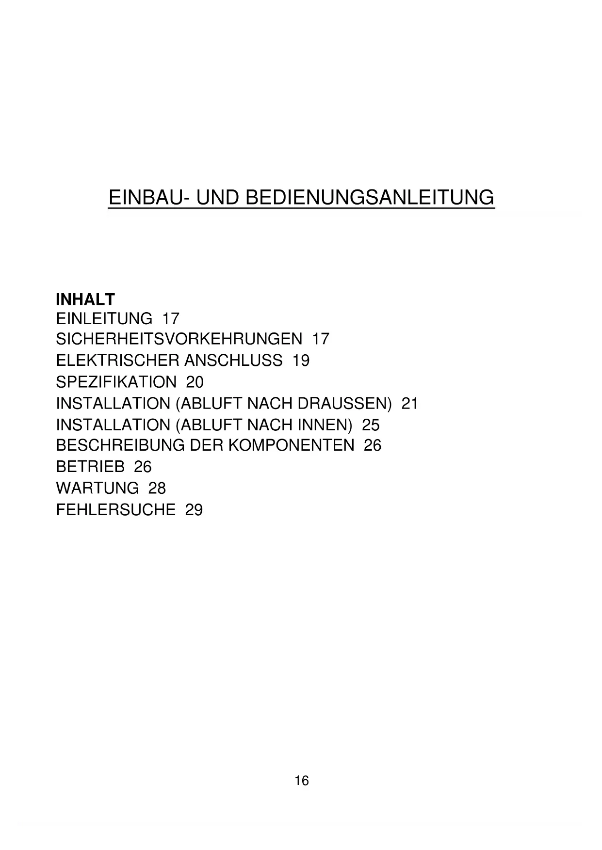 INHALT EINLEITUNG 17 SICHERHEITSVORKEHRUNGEN 17 ELEKTRISCHER ANSCHLUSS 19 SPEZIFIKATION 20