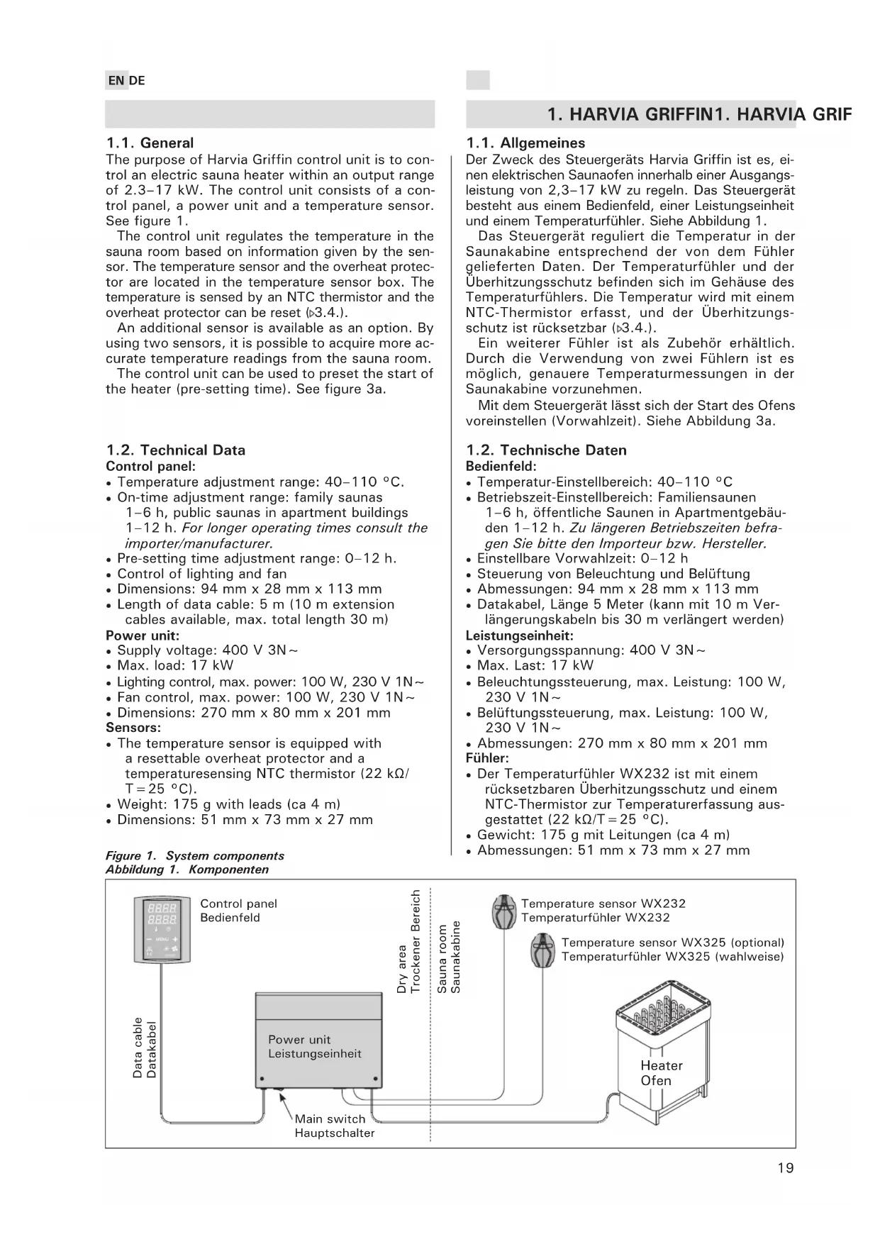 - Dimensions: 51 mm x 73 mm x 27 mm Figure 1. System components Abbildung 1. Komponenten Temperature sensor WX232 Temperaturfühler WX232 Heater Ofen Control panel Bedienfeld Power unit Leistungseinheit Sauna room Saunakabine Dry area Trockener Bereich Temperature sensor WX325 (optional) Temperaturfühler WX325 (wahlweise) Main switch Hauptschalter 1.1. Allgemeines Der Zweck des Steuergeräts Harvia Griffin ist es, ei- nen elektrischen Saunaofen innerhalb einer Ausgangs- leistung von 2,3–17 kW zu regeln. Das Steuergerät besteht aus einem Bedienfeld, einer Leistungseinheit und einem Temperaturfühler. Siehe Abbildung 1. Das Steuergerät reguliert die Temperatur in der Saunakabine entsprechend der von dem Fühler gelieferten Daten. Der Temperaturfühler und der Überhitzungsschutz befinden sich im Gehäuse des Temperaturfühlers. Die Temperatur wird mit einem NTC-Thermistor erfasst, und der Überhitzungs- schutz ist rücksetzbar (