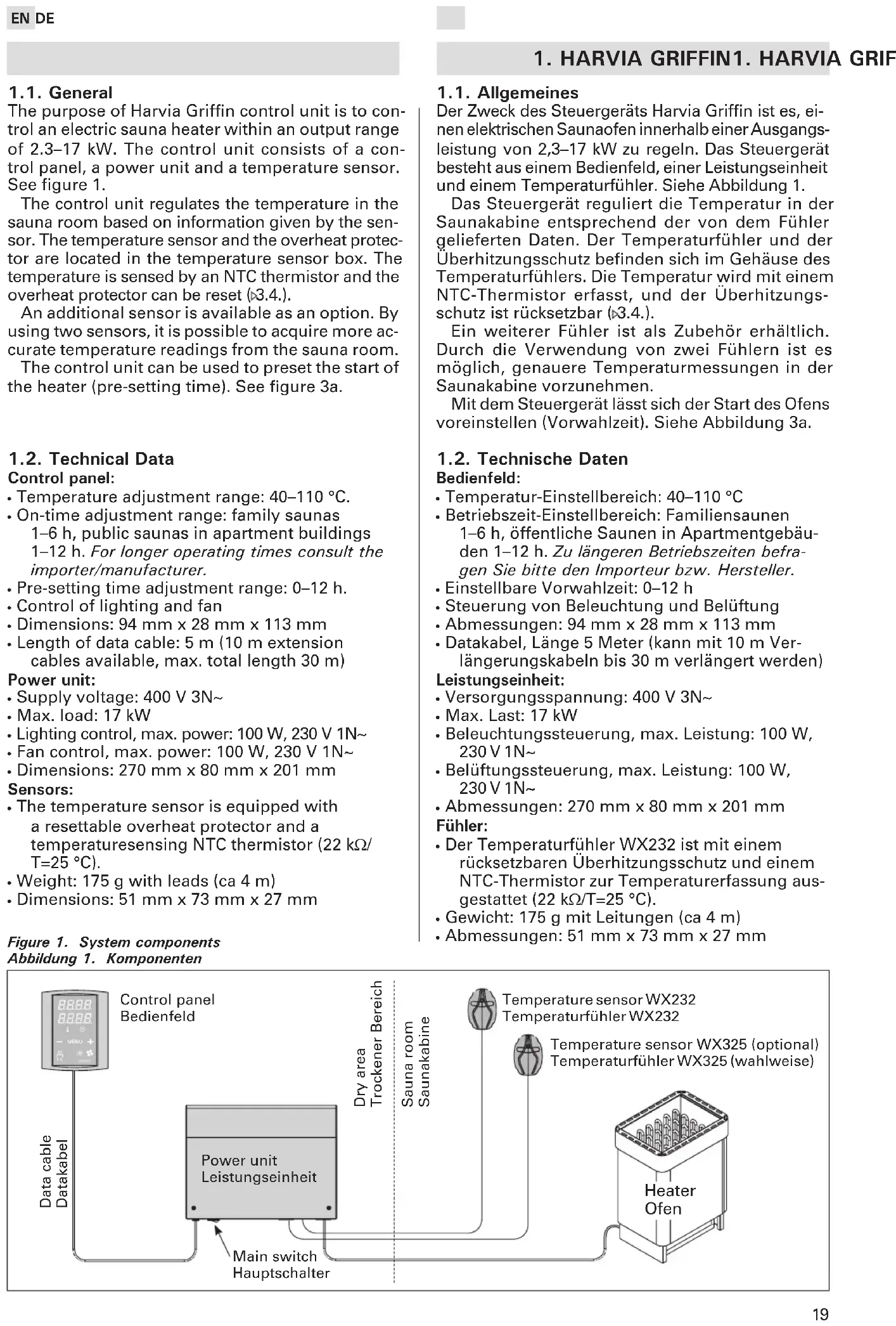 - Dimensions: 51 mm x 73 mm x 27 mm Figure 1. System components Abbildung 1. Komponenten Temperature sensor WX232 Temperaturfühler WX232 Heater Ofen Control panel Bedienfeld Power unit Leistungseinheit Sauna room Saunakabine Dry area Trockener Bereich Temperature sensor WX325 (optional) Temperaturfühler WX325 (wahlweise) Main switch Hauptschalter 1.1. Allgemeines Der Zweck des Steuergeräts Harvia Grifn ist es, ei- nen elektrischen Saunaofen innerhalb einer Ausgangs- leistung von 2,3–17 kW zu regeln. Das Steuergerät besteht aus einem Bedienfeld, einer Leistungseinheit und einem Temperaturfühler. Siehe Abbildung 1. Das Steuergerät reguliert die Temperatur in der Saunakabine entsprechend der von dem Fühler gelieferten Daten. Der Temperaturfühler und der Überhitzungsschutz benden sich im Gehäuse des Temperaturfühlers. Die Temperatur wird mit einem NTC-Thermistor erfasst, und der Überhitzungs- schutz ist rücksetzbar ( 3.4.). Ein weiterer Fühler ist als Zubehör erhältlich. Durch die Verwendung von zwei Fühlern ist es möglich, genauere Temperaturmessungen in der Saunakabine vorzunehmen. Mit dem Steuergerät lässt sich der Start des Ofens voreinstellen (Vorwahlzeit). Siehe Abbildung 3a. 1.2. Technische Daten Bedienfeld: