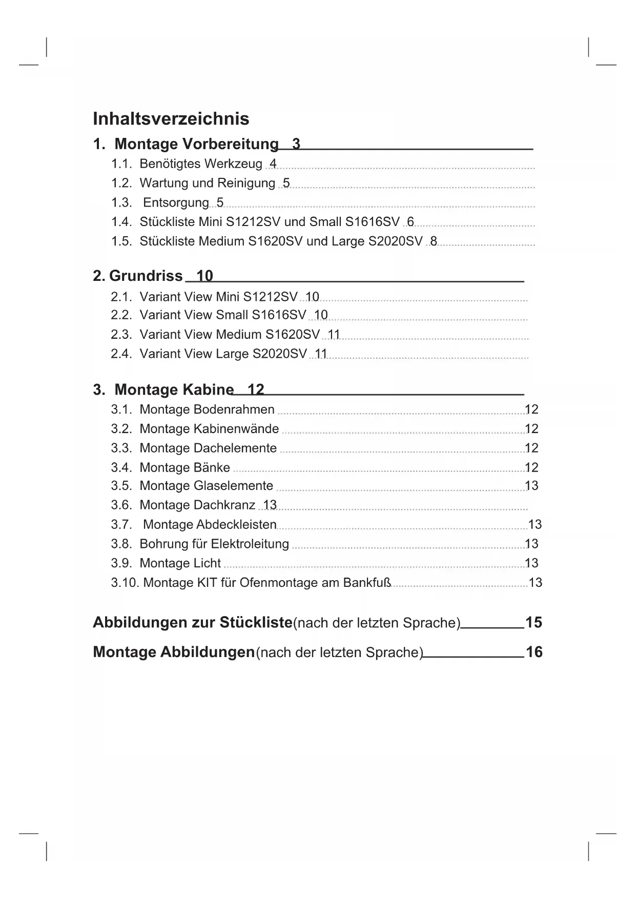 3.1. Montage Bodenrahmen 12 3.2. Montage Kabinenwände 12 3.3. Montage Dachelemente 12 3.4. Montage Bänke 12 3.5. Montage Glaselemente 13 3.6. Montage Dachkranz 13 3.7. Montage Abdeckleisten 13 3.8. Bohrung für Elektroleitung 13 3.9. Montage Licht 13 3.10. Montage KIT für Ofenmontage am Bankfuß 13 Abbildungen zur Stückliste(nach der letzten Sprache) 15 Montage Abbildungen (nach der letzten Sprache) 16DE Montageanleitung S. 3/14