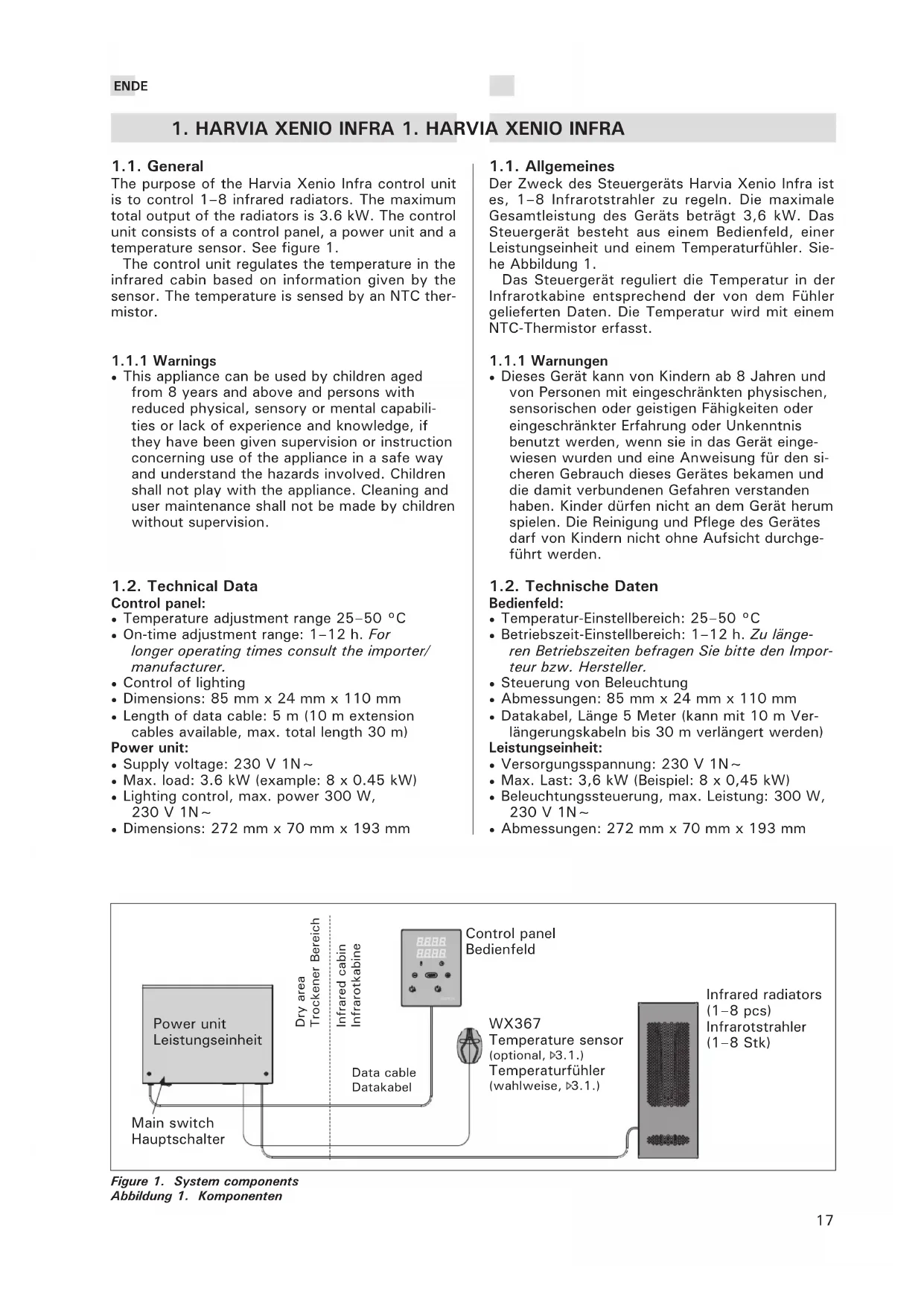 - 4. RESERVDELAR These instructions for installation and use are in- tended for owners of infrared cabins, radiators and control units, persons in charge of managing infra- red cabins, radiators and control units, and for elec- tricians responsible for installing radiators and con- trol units. Once the control unit is installed, these instructions of installation and use are handed over to the owner of the infrared cabin, radiators and control unit, or to the person in charge of maintain- ing them. CONTROL UNIT HARVIA XENIO INFRA (CX36I) Control unit's purpose of use: The control unit is meant for controlling the functions of infrared ra- diators. It is not to be used for any other purpose. Congratulations on making an excellent choice! Diese Montage- und Gebrauchsanleitung richtet sich an Besitzer von Infrarotkabinen, Infrarotstrahler und Steuergeräten, an Personen, die für den Betrieb von Infrarotkabinen, Infrarotstrahler und Steuergeräten verantwortlich sind, sowie an Elektromonteure, die mit der Montage von Infrarotstrahler und Steuerge- räten betraut sind. Nach der Montage des Steuer- geräts ist diese Montage- und Gebrauchsanleitung dem Besitzer der Infrarotkabine, des Strahlers bzw. des Steuergeräts oder der für die Wartung der An- lagen zuständigen Person auszuhändigen. STEUERGERÄT HARVIA XENIO INFRA (CX36I) Verwendungszweck des Steuergeräts: Das Steuergerät dient zur Steuerung der Funktionen der Infrarotstrahler. Er darf nicht für andere Zwecke verwendet werden. Wir beglückwünschen Sie zu Ihrer guten Wahl! CONTENTS p. 16