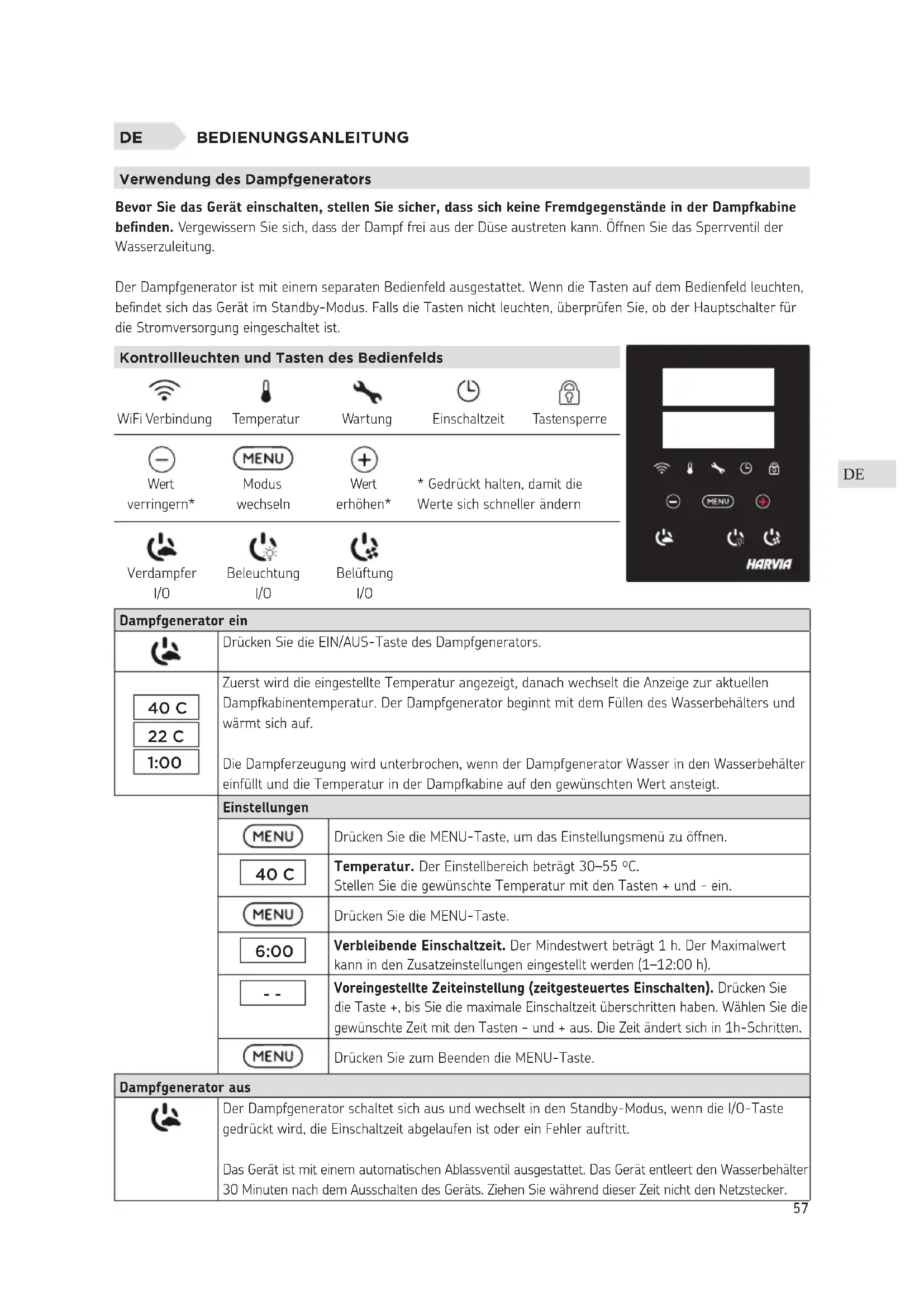 LESEN SIE DIE WARNUNGEN UND DIE BEDIENUNGSANLEITUNG SORGFÄLTIG DURCH, BEVOR SIE DAS PRODUKT VERWENDEN! Diese Installations- und Betriebsanleitung richtet sich an den Besitzer oder die für die Dampfkabine und das Produkt verantwortliche Person sowie an die Person, die für die Installation des Produkts verantwortlich ist. Nach Abschluss der Installation sollte die für die Installation verantwortliche Per- son diese Anleitung dem Besitzer des Produkts oder der für seinen Betrieb verantwortlichen Person übergeben. Weitere Anweisungen zu Installation, Gebrauch und Recycling finden Sie unter www. harvia.com. (Original-Betriebsanleitung des Herstellers) WARNUNG!