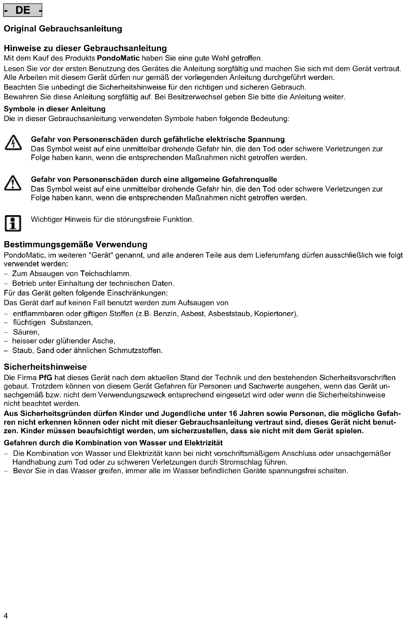 PondoMatic, im weiteren "Gerät" genannot, und alle anderen Teile aus dem Lieferumfang)duren ausschließlich wie folgt verwendet werden: