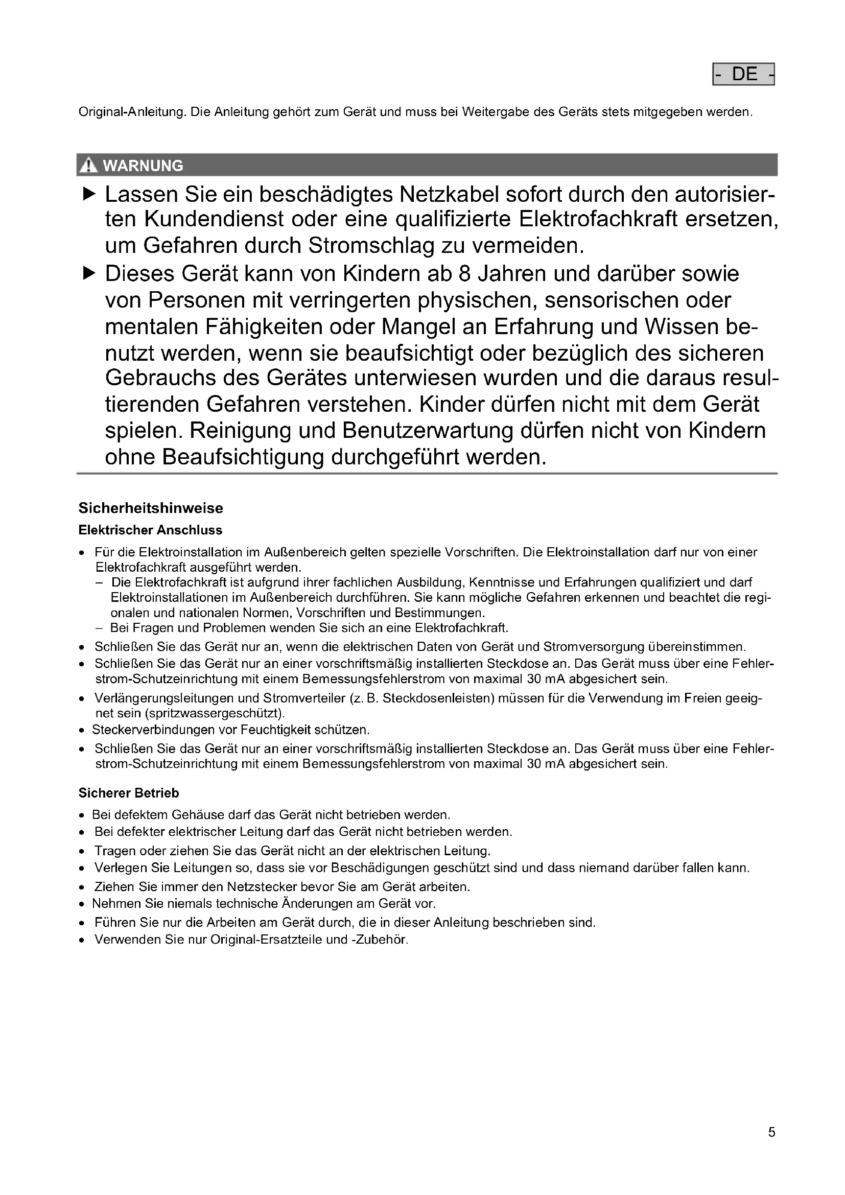 - DE - Original-Anleitung. Die Anleitung gehört zum Gerät und muss bei Weitergabe des Geräts stets mitgegeben werden.