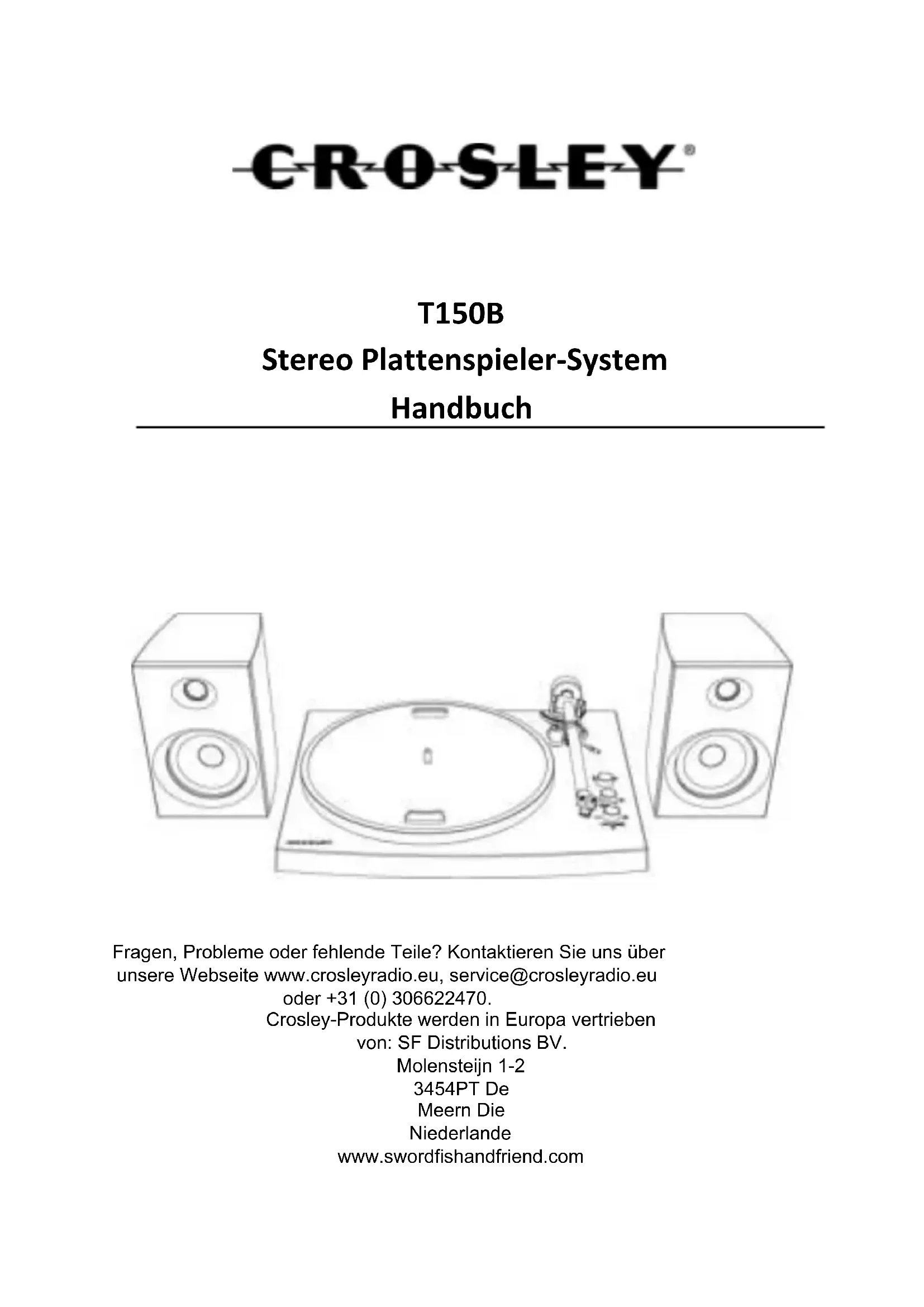 Con la presente la Modern Marketing Concepts Inc. dba Crosley Brands dichiara che questa tipologia di dispositivo è conforme alla Direttiva 2014/53/UE. Il testo integrale della dichiarazione di conformità UE è reperibile su Internet al seguente indirizzo: http://crosleybrands.com/euDoCT150B Stereo Plattenspieler-System Handbuch Fragen, Probleme oder fehlende Teile? Kontaktieren Sie uns über unsere Webseite www.crosleyradio.eu, service@crosleyradio.eu oder +31 (0) 306622470. Crosley-Produkte werden in Europa vertrieben von: SF Distributions BV. Molensteijn 1-2 3454PT De Meern Die Niederlande www.swordfishandfriend.comDeutsc Sicherheitshinweise Lesen und verstehen Sie dieses Handbuch vollständig, bevor Sie das Produkt verwenden. Bewahren Sie dieses Handbuch zum späteren Nachschlagen auf.